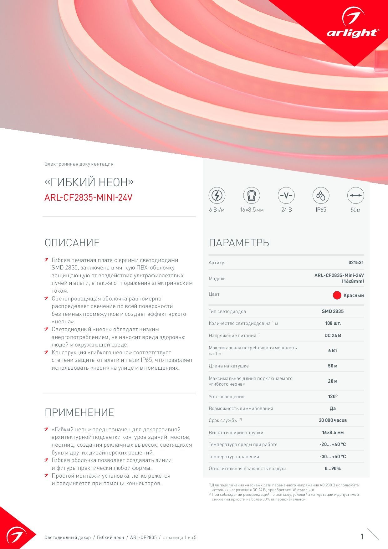 021531 Гибкий неон ARL-CF2835-Mini-24V Red (16x8mm) (Arlight, 6 Вт/м, IP65)
