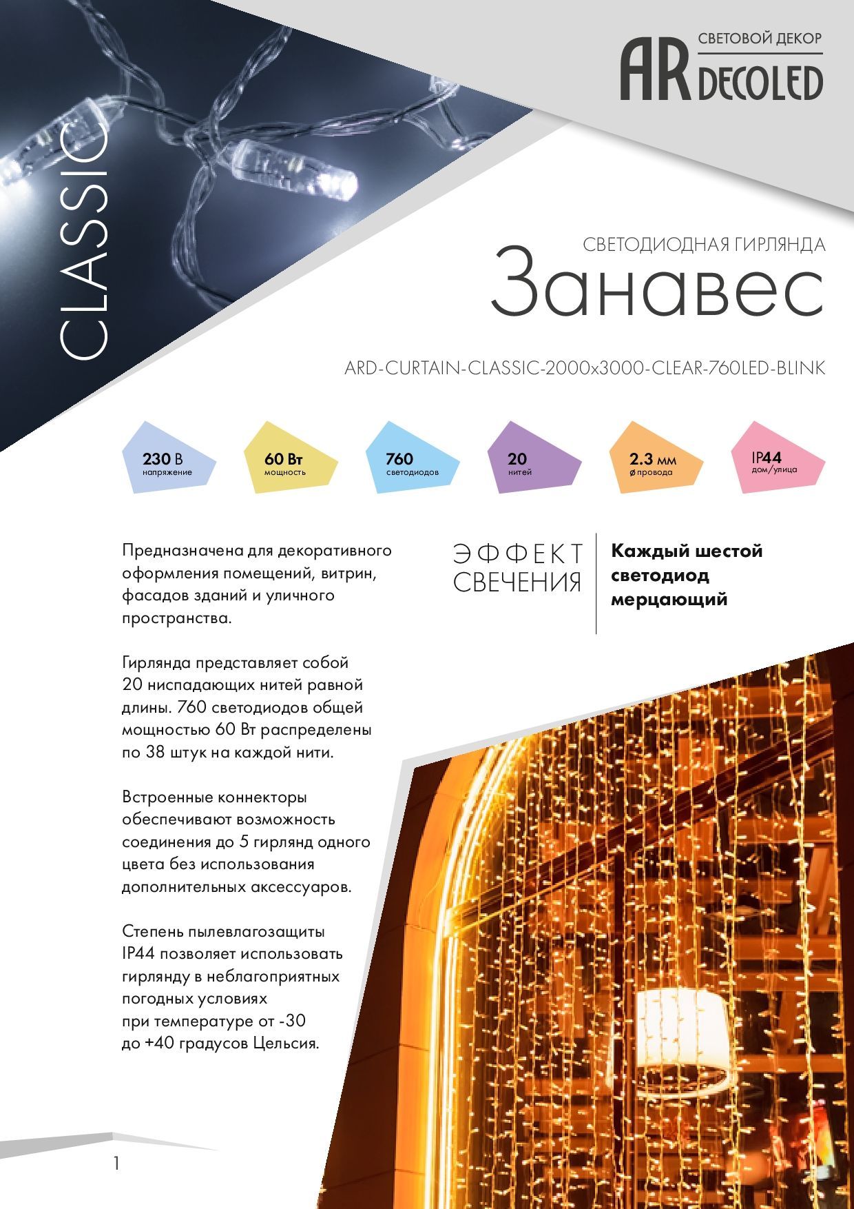 024869 Светодиодная гирлянда ARD-CURTAIN-CLASSIC-2000x3000-CLEAR-760LED-BLINK Warm-White (230V, 60W) (Ardecoled, IP65)