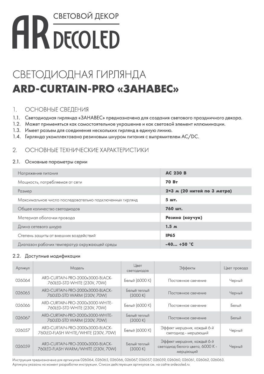 Светодиодная гирлянда ARD-CURTAIN-PRO-2000x3000-BLACK-760LED-FLASH WARM/WARM (230V, 70W) (Ardecoled, IP65) Arlight 026060