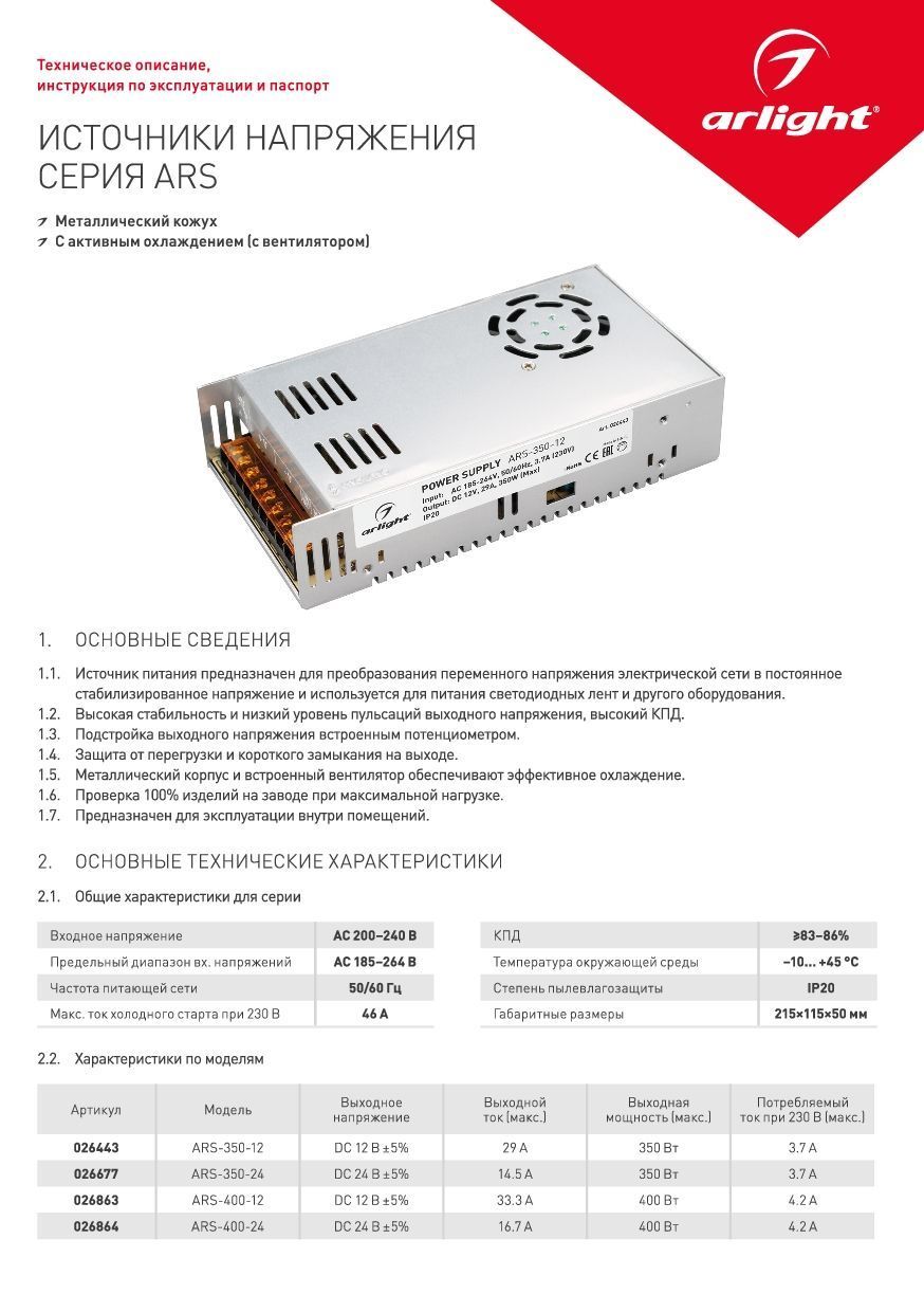 Выбирая блок питания ARlight ARS-400-24, вы выбираете технологичность и надежность, подкреплённую высоким стандартом качества от проверенного производителя. Приобретайте в интернет-магазине '' и оцените производительность и долговечность светотехнического оборудования от Arlight.