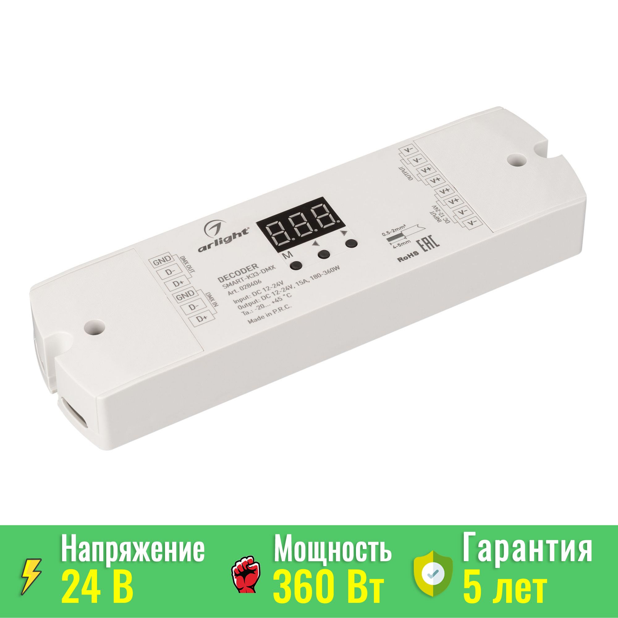 Декодер SMART-K33-DMX предназначен для трансляции цифрового сигнала DMX512 в аналоговый сигнал ШИМ (PWM). Проще говоря, это устройство позволяет подключать стандартные светодиодные ленты и другие LED-светильники к профессиональным системам управления освещением, работающим по протоколу DMX512.