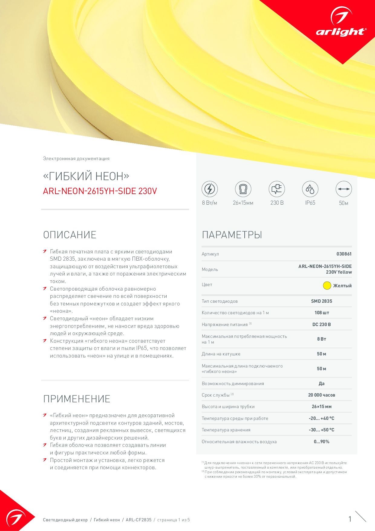 030861 Гибкий неон ARL-NEON-2615YH-SIDE 230V Yellow (Arlight, 8 Вт/м, IP65)