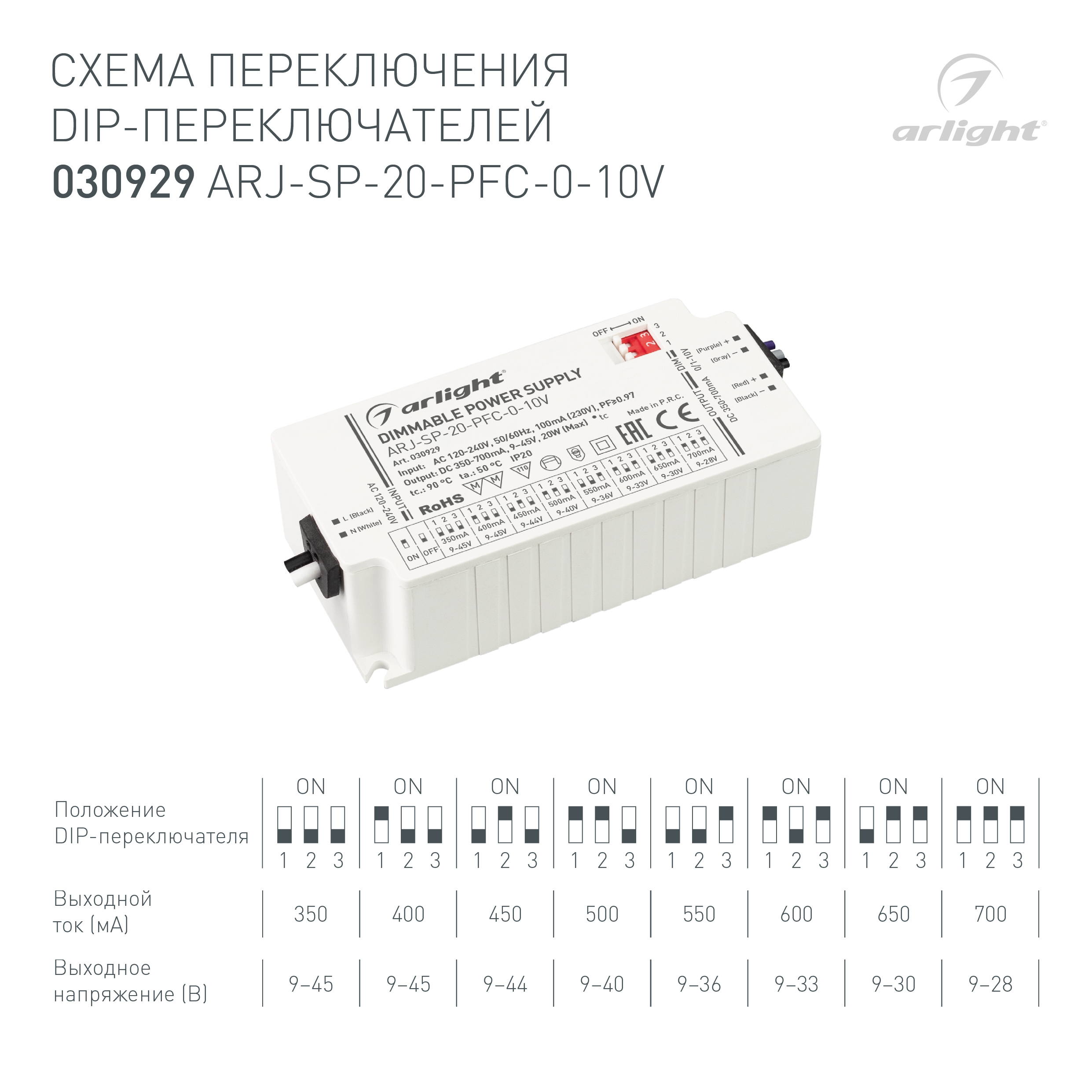 030929 Блок питания ARJ-SP-20-PFC-0-10V (20W, 350-700mA) (Arlight, IP20 Пластик)