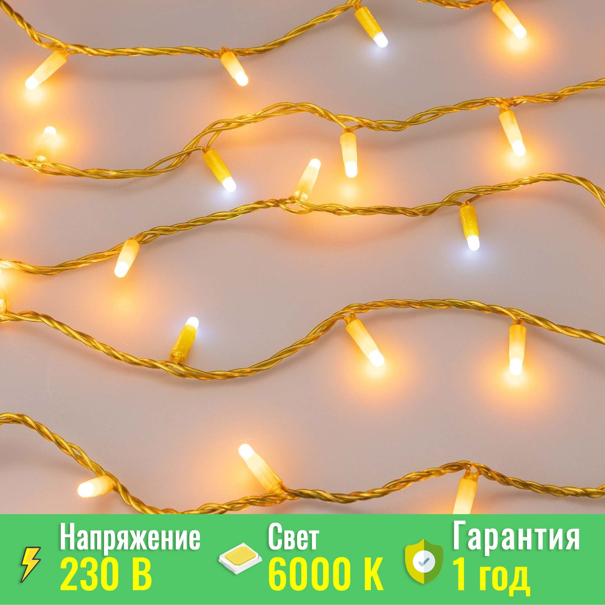 Светодиодная нить Classic. Размер 10000 мм. 100 светодиодов размером 7 мм. Основной цвет свечения ЖЕЛТЫЙ, эффект мерцания редких точек (БЕЛЫЙ 6000К) с мягким световым рисунком (выпуклая молочно-белая линза), соотношение светодиодов: 84 желтых постоянного свечения / 16 белых с мерцанием. Эффект частого мерцания. Провод желтый, ПВХ. Питание 230 В, Мощность 7 Вт, защита IP65, применение в помещении и на улице под навесом. Аксессуары для подключения и управления приобретаются отдельно. Заказать товар 031201 вы можете в Москве по телефону 8 (495) 212-26-01.