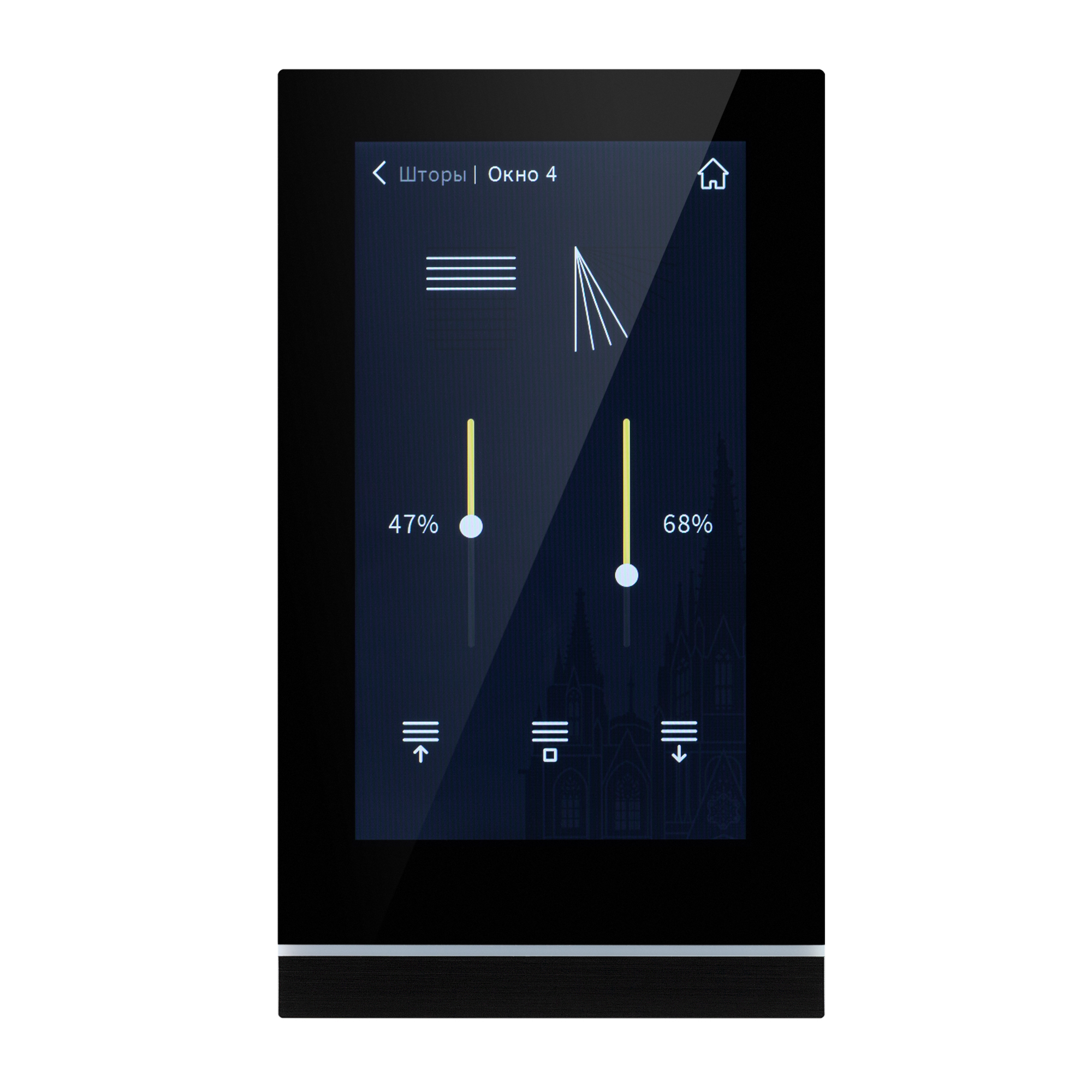 Сенсорная панель выполнена в стильном черном цвете, который гармонично впишется в любой интерьер. Корпус выполнен из качественного пластика и стекла, а благодаря классу пылевлагозащиты IP20, панель оптимальна для использования в закрытых помещениях. Габариты устройства составляют 149x86x32 мм, что делает его компактным и удобным для установки.