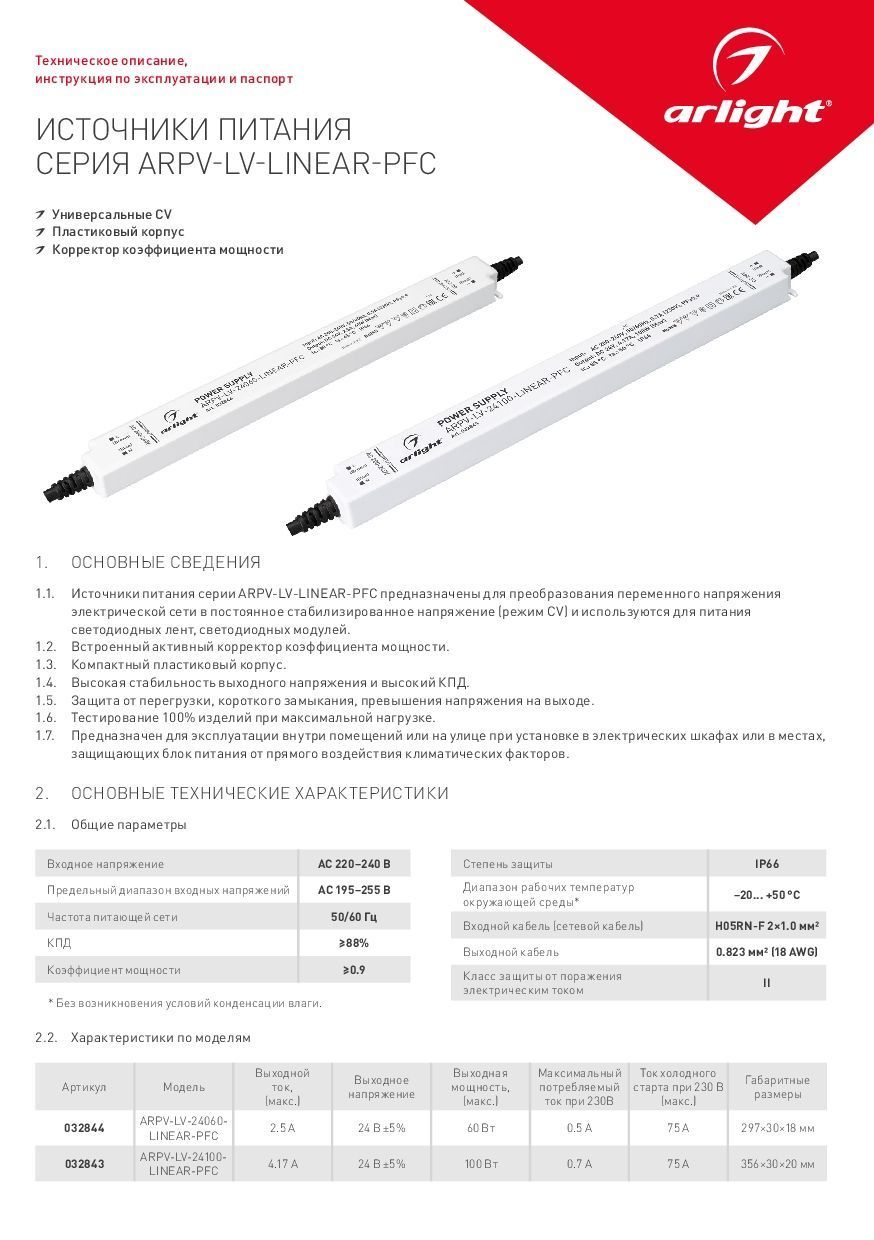 Блок питания ARPV-LV-24060-LINEAR-PFC (24V, 2.5A, 60W) (Arlight, IP66 Пластик) Arlight 032844