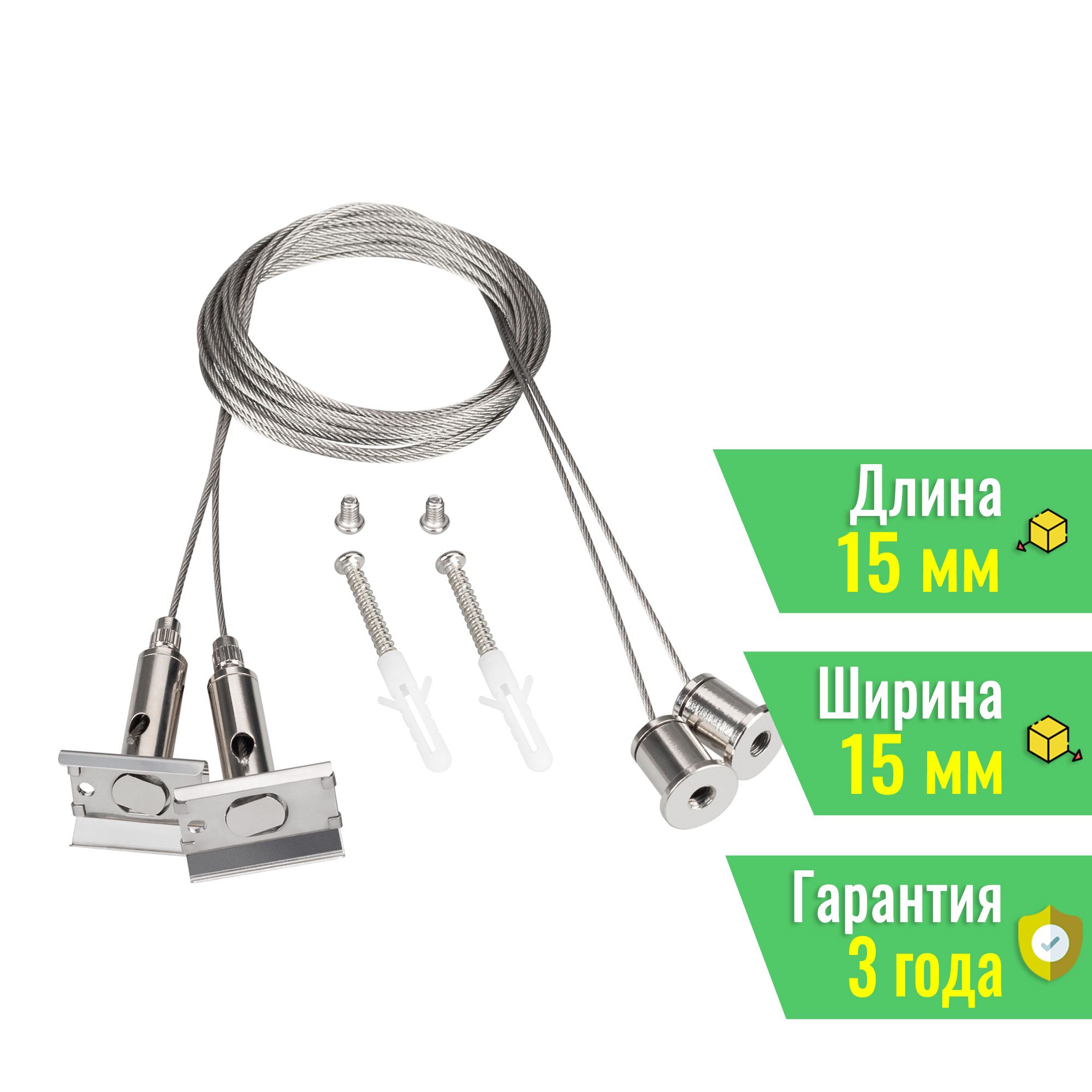 В комплект входят два регулируемых троса длиной 2 метра и необходимые элементы крепления: винты с площадкой размером 9х12х2 мм, держатели, шурупы с дюбелями, шайбы гровер и винты для установки держателя. Этот набор позволяет легко и быстро зафиксировать светильник на нужном расстоянии от потолка, обеспечивая надежное крепление и эстетически привлекательный вид.
