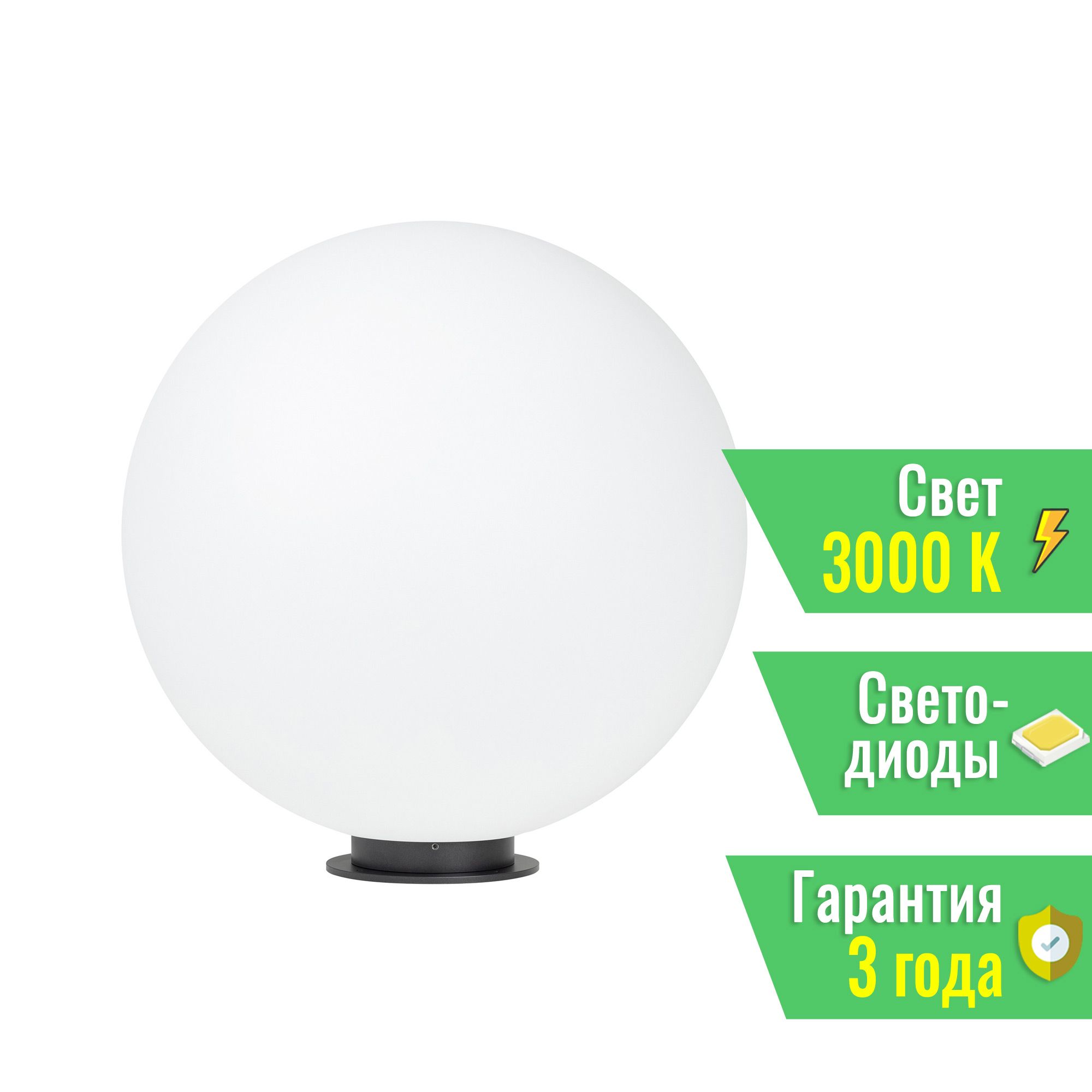 Декоративный ландшафтный светильник. Мощность 15 Вт, св. поток 1500 лм, 100 лм/Вт, теплый 3000 K, CRI>80, угол 275°, напряжение питания 24 В. Белый светопропускающий сферический рассеиватель из LLDPE (линейный полиэтилен низкой плотности), основание из алюминия серого цвета, степень защиты IP65. Размер: диаметр 500 мм, высота 500 мм. Монтаж на твердую поверхность или в грунт с помощью двух оснований пик (входят в комплект поставки). Допускается регулирование светового потока ШИМ. Заказать товар 051030 вы можете в Москве по телефону 8 (495) 212-26-01.