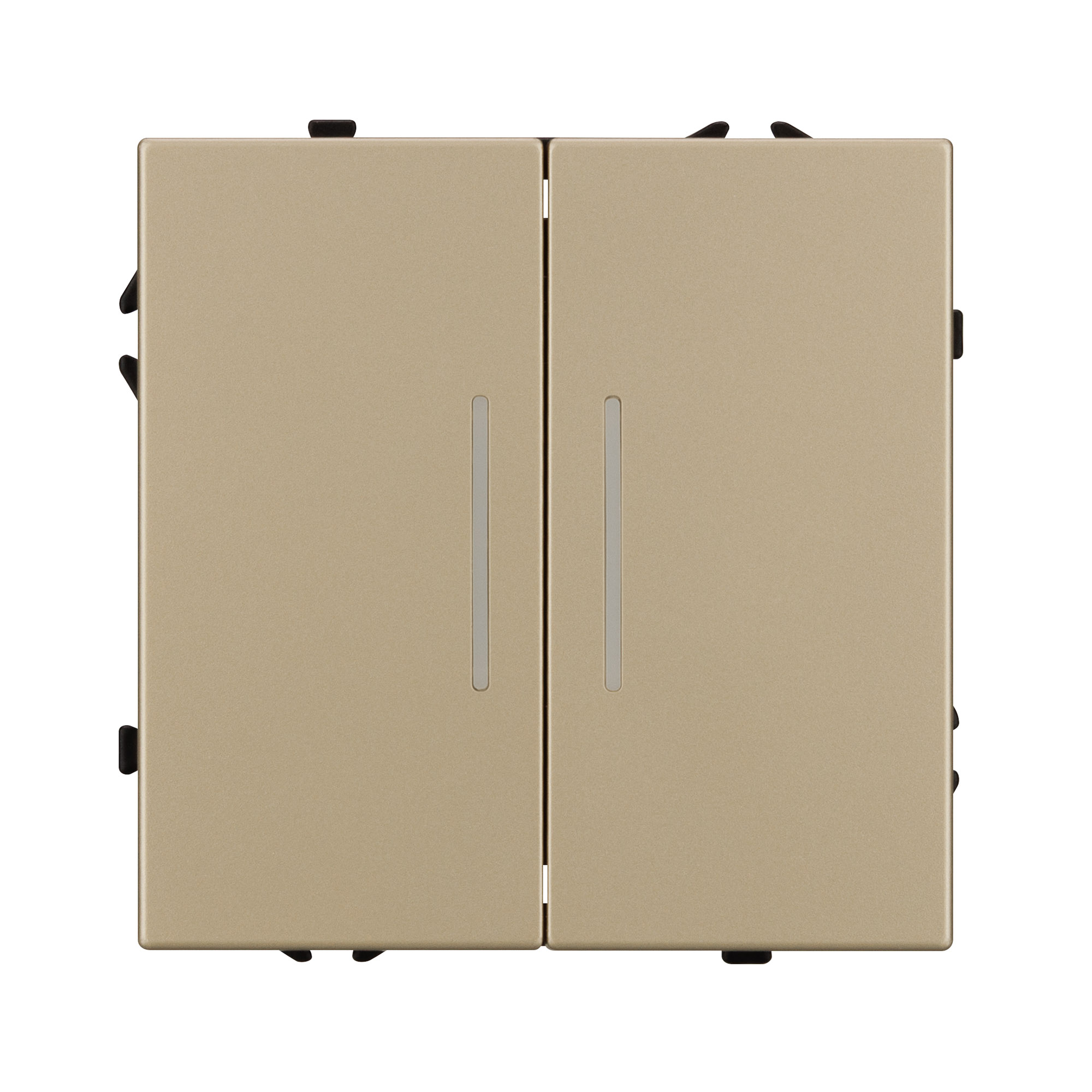 Механизм выключателя света клавишный на 1 пост 2 клавиши (проходной). Цвет - золотой, с Soft-Touch покрытием. Клавиша имеют активную LED подсветку - cинего свечения. Без фронтальной рамки. Уровень пылевлагозащиты IP20. Выключатель устанавливается в стандартный круглый подрозетник круглого сечения диаметром 60мм.