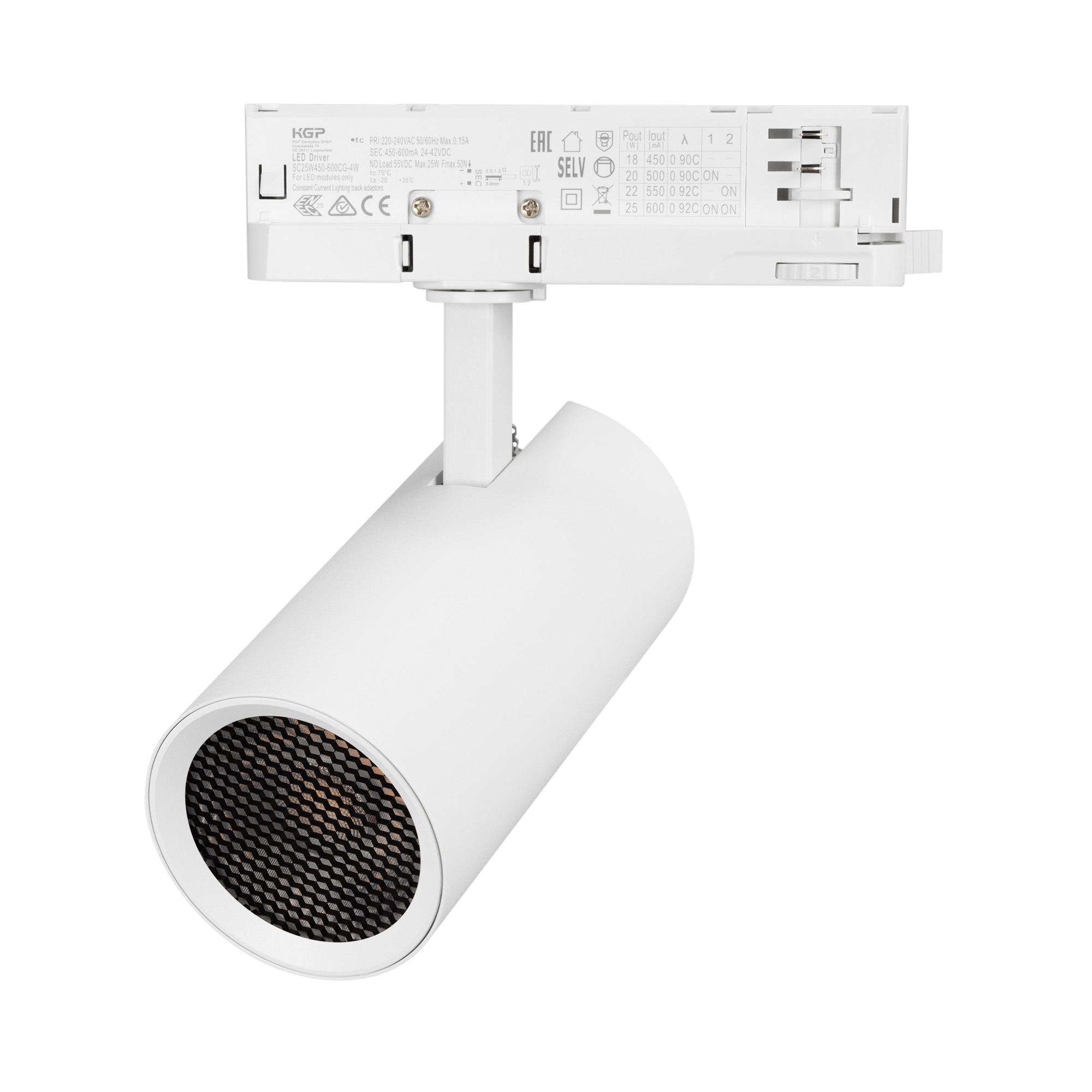 Светильник для треков/шин 4 провода. Мощность 20 Вт, св. поток без решетки honeycomb 2000 лм, 100 лм/Вт, с решеткой honeycomb 1320 лм, 66 лм/Вт, теплый 3000 K, CRI>90, угол 24°, напряжение питания 230 В. Белый круглый корпус из алюминия, материал линзы PMMA, степень защиты IP20. Антибликовая решетка honeycomb в комплекте. Размер: диаметр 74 мм, длина световой части 154 мм. Монтаж на трек 3-фазный. Драйвер встроенный 24-42 В, 500мА., пульсация <5% Заказать товар 055171 вы можете в Москве по телефону 8 (495) 212-26-01.