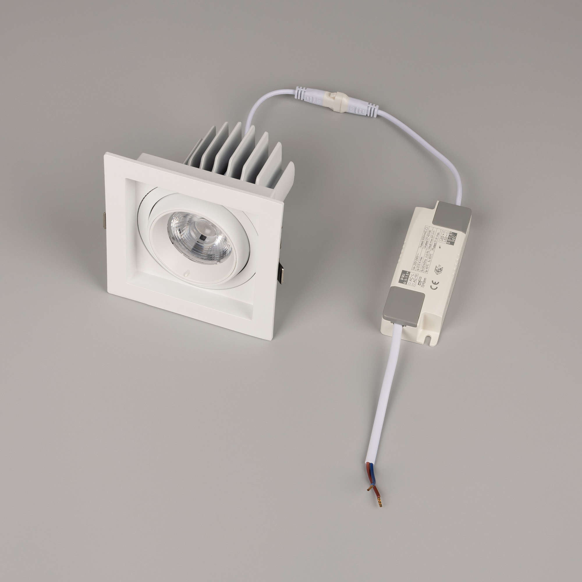Встраиваемый карданный светильник. Мощность 20 Вт, св. поток 2132 лм, 107 лм/Вт, дневной 4000 K, CRI>92, угол 40°, напряжение питания 230 В. Белый корпус из алюминия, белая вставка, степень защиты IP20. Размер: длина 117 мм, ширина 117 мм, высота 105 мм. Монтаж встраиваемый, установочное отверстие: длина 95 мм, ширина 95 мм. Драйвер 24-42 В, 500 мА, пульсация <2%. Заказать товар 057919 вы можете в Москве по телефону 8 (495) 212-26-01.