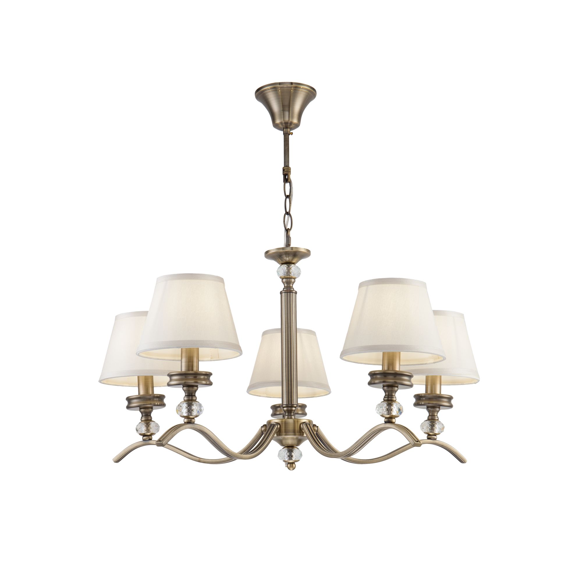 Люстра Alessandra из коллекции Classic представляет собой величественную подвесную конструкцию с пятью плафонами. Металлическая арматура благородного оттенка Бронза Антик изящно контрастирует с белоснежными текстильными абажурами конической формы. Особый шарм светильнику придает декоративный элемент из стекла, который становится изящным акцентом всей композиции.