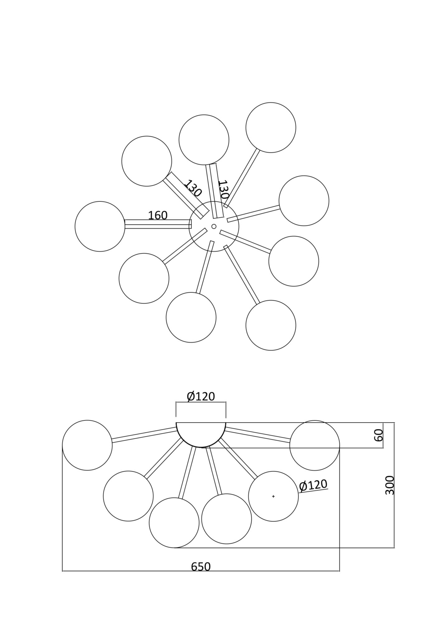 Дизайн люстры выполнен в современном стиле, который гармонично сочетается с различными интерьерными решениями. Модель имеет круглую форму с диаметром 650 мм и высотой 300 мм, что делает её оптимальной для помещений средней и большой площади. Светильник оснащен 9 стеклянными плафонами сферической формы белого цвета, каждый диаметром 120 мм, которые создают мягкое и равномерное освещение.