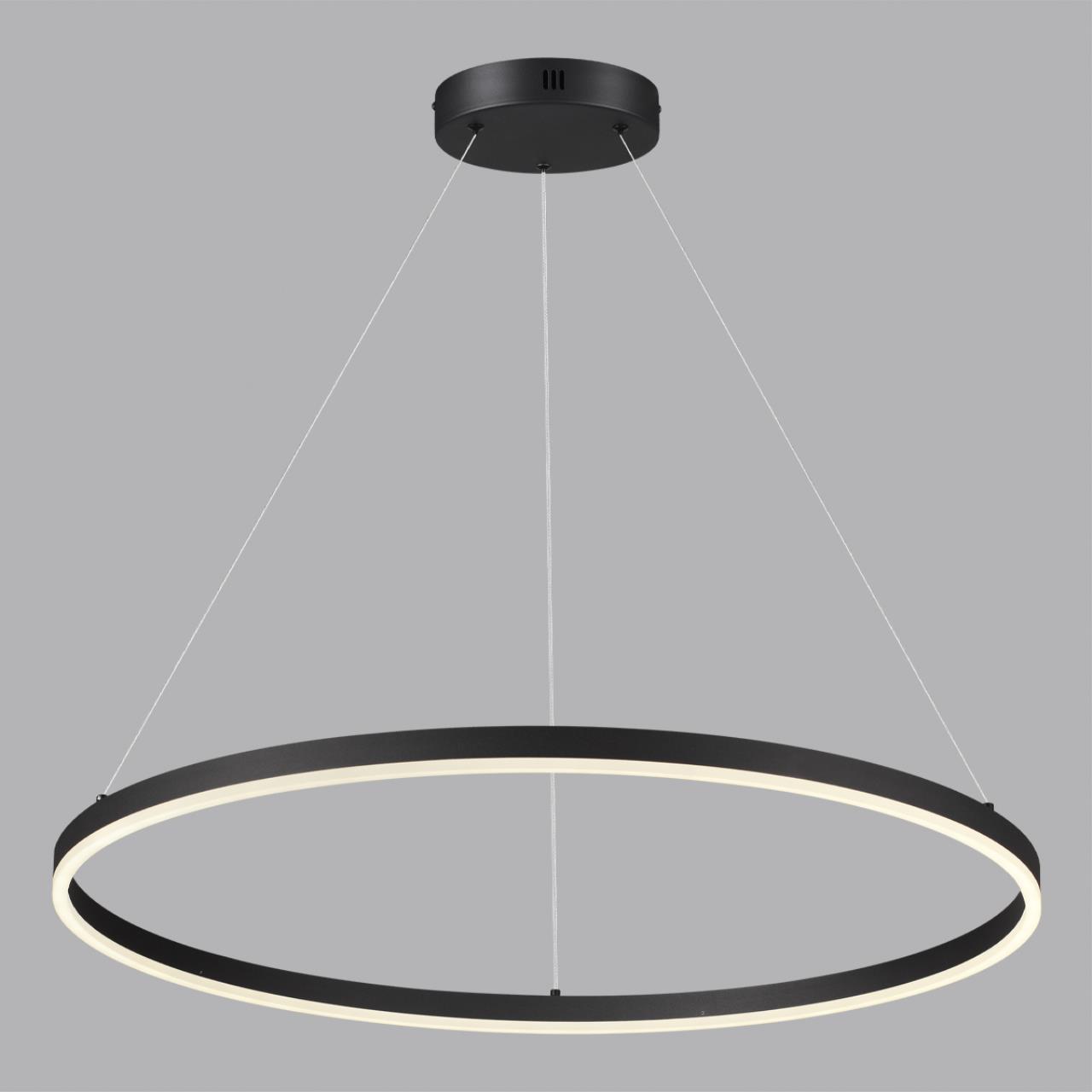 Светильник выполнен в форме кольца диаметром 800 мм с тонким профилем высотой всего 25 мм. Полная высота с подвесом составляет 1000 мм, что позволяет гармонично вписать его в помещения с разной высотой потолка. Матовая черная отделка алюминиевого корпуса придает изделию строгий и элегантный вид, характерный для стиля хай-тек.