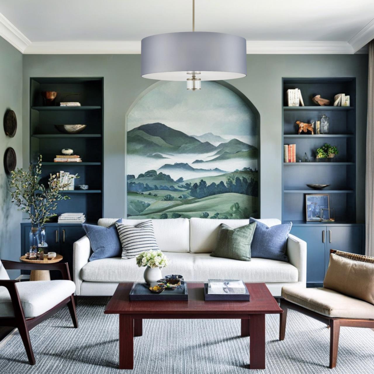 Благодаря текстильным абажурам и акриловому рассеивателю, свет распределяется мягко и равномерно, создавая комфортную атмосферу без резких теней и бликов. Это идеальное решение для основного освещения гостиной, спальни, столовой или просторного коридора.