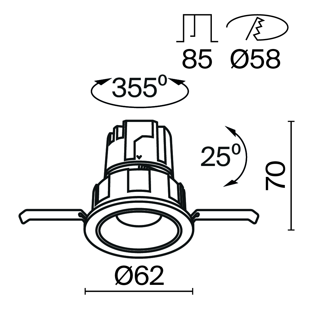 Светильник предназначен для встраиваемого монтажа в подвесной или натяжной потолок. Для установки потребуется круглое монтажное отверстие диаметром 58 мм и глубиной 85 мм. Класс электрозащиты Class2 (с двойной изоляцией) обеспечивает безопасность использования без необходимости подключения заземляющего провода. Степень защиты IP20 указывает на то, что светильник предназначен для использования в сухих помещениях, защищен от проникновения твердых предметов размером более 12 мм.