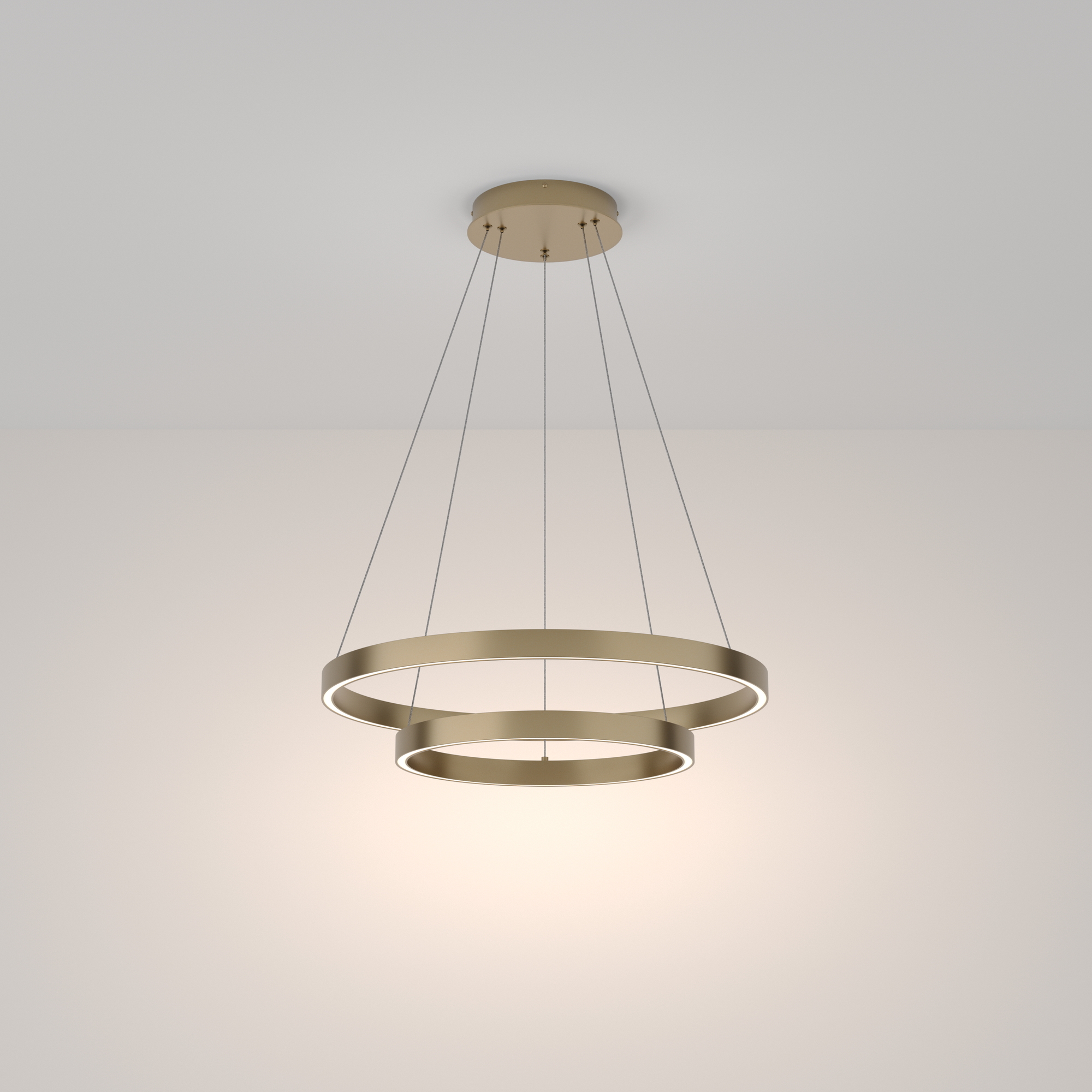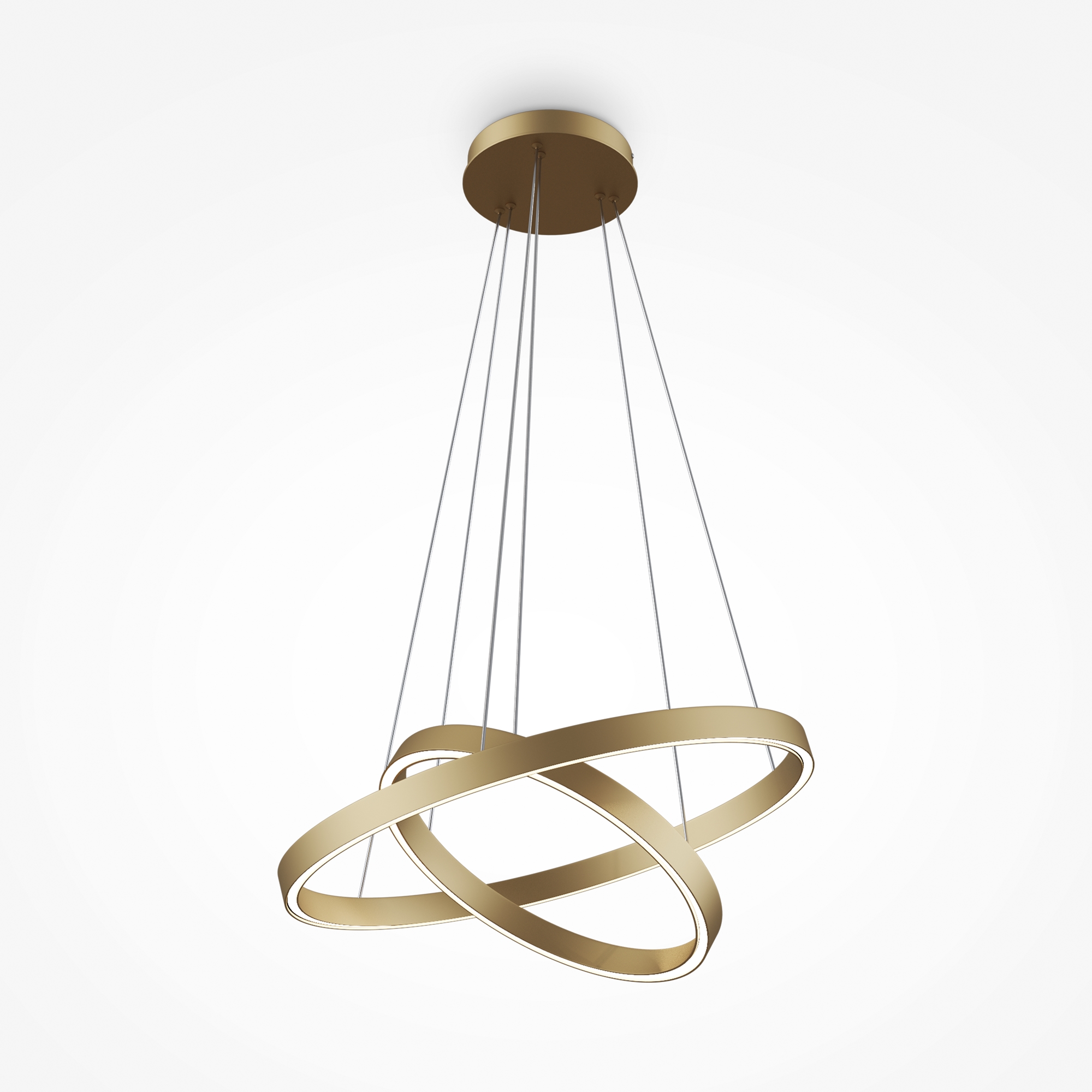 Светильник выполнен в стиле Maytoni Modern, что подразумевает лаконичность форм, функциональность и элегантность. Основу конструкции составляет алюминиевая арматура, окрашенная в благородный оттенок латуни, что придает изделию роскошный вид. Диаметр светильника составляет 600 мм, а максимальная высота конструкции достигает 1200 мм. При этом минимальная высота может быть уменьшена до 100 мм благодаря регулируемому положению подвесных колец.
