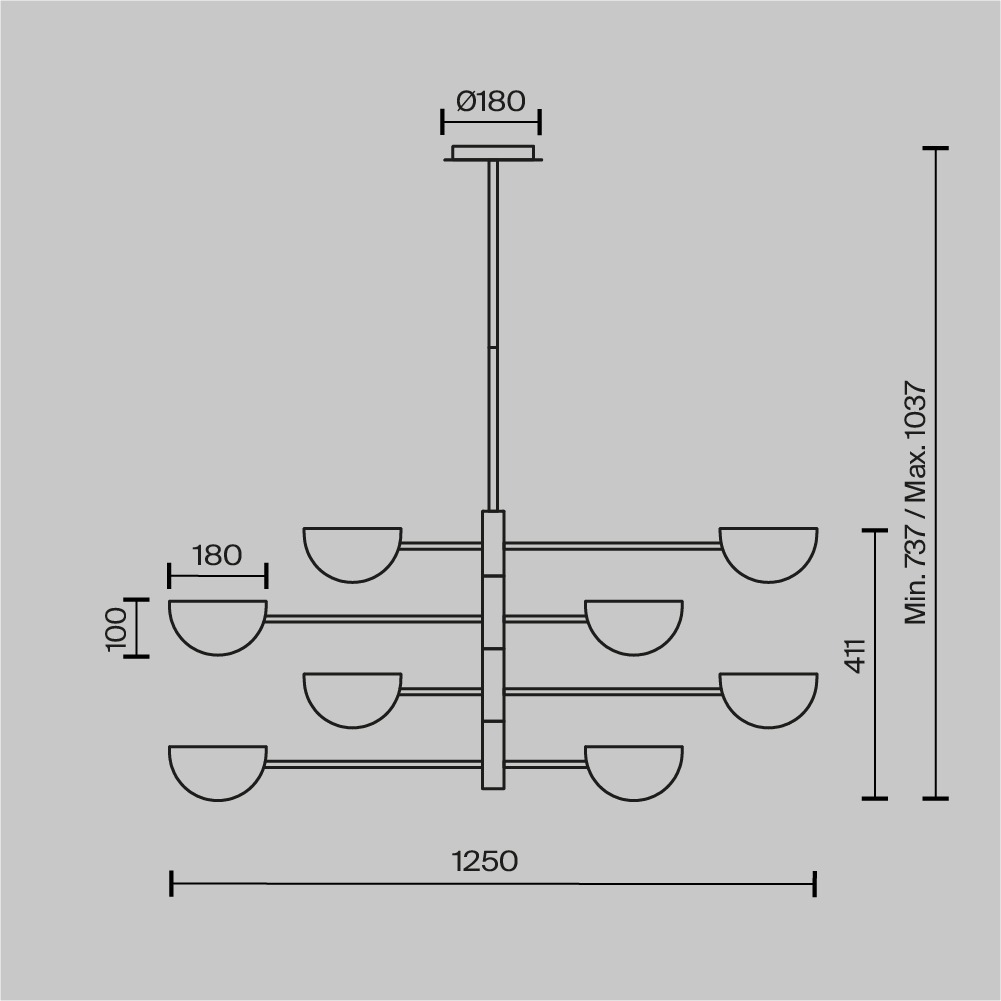 Обратите внимание на регулируемую высоту подвеса – от 737 до 1037 мм, что позволяет адаптировать светильник под разную высоту потолков и дизайнерские решения интерьера.