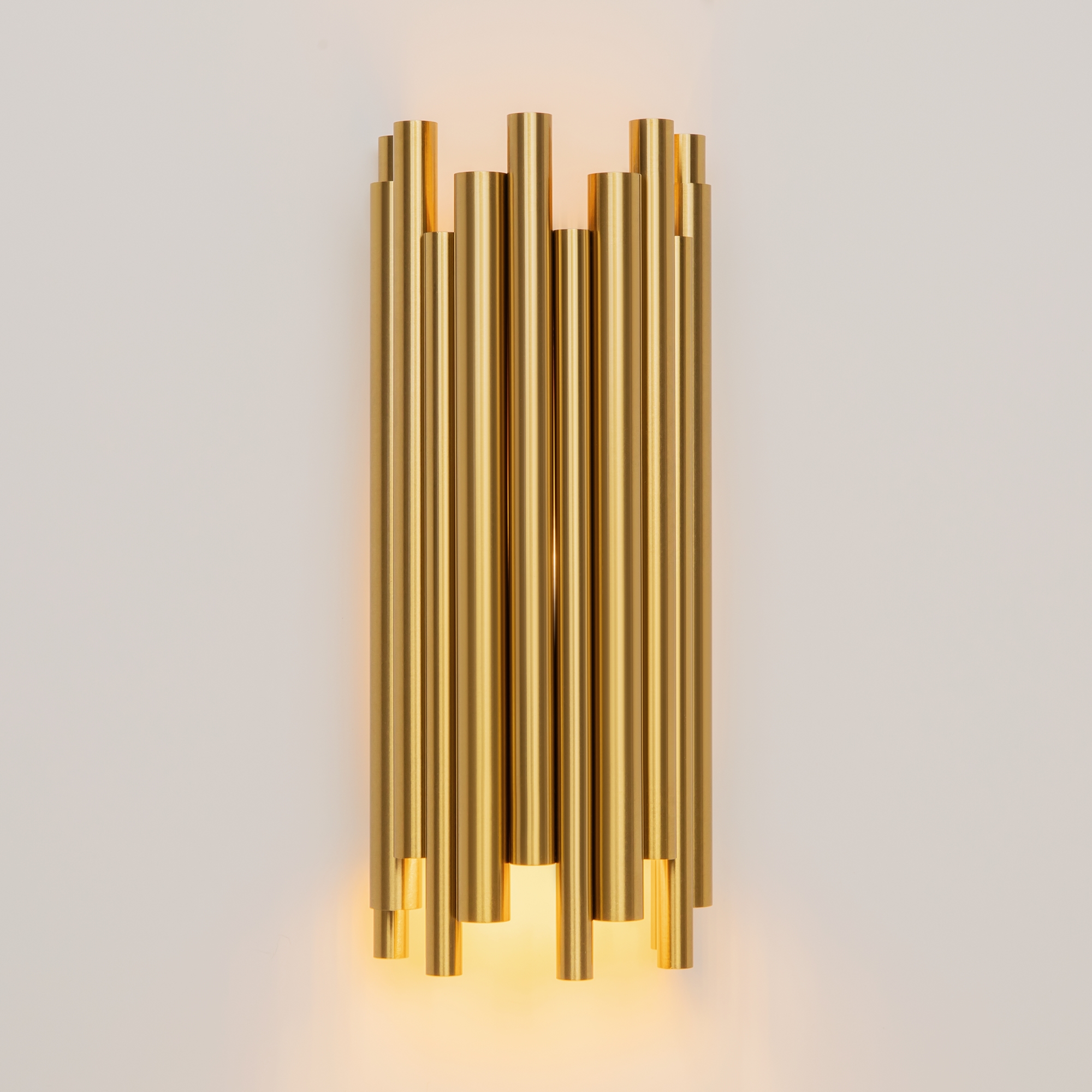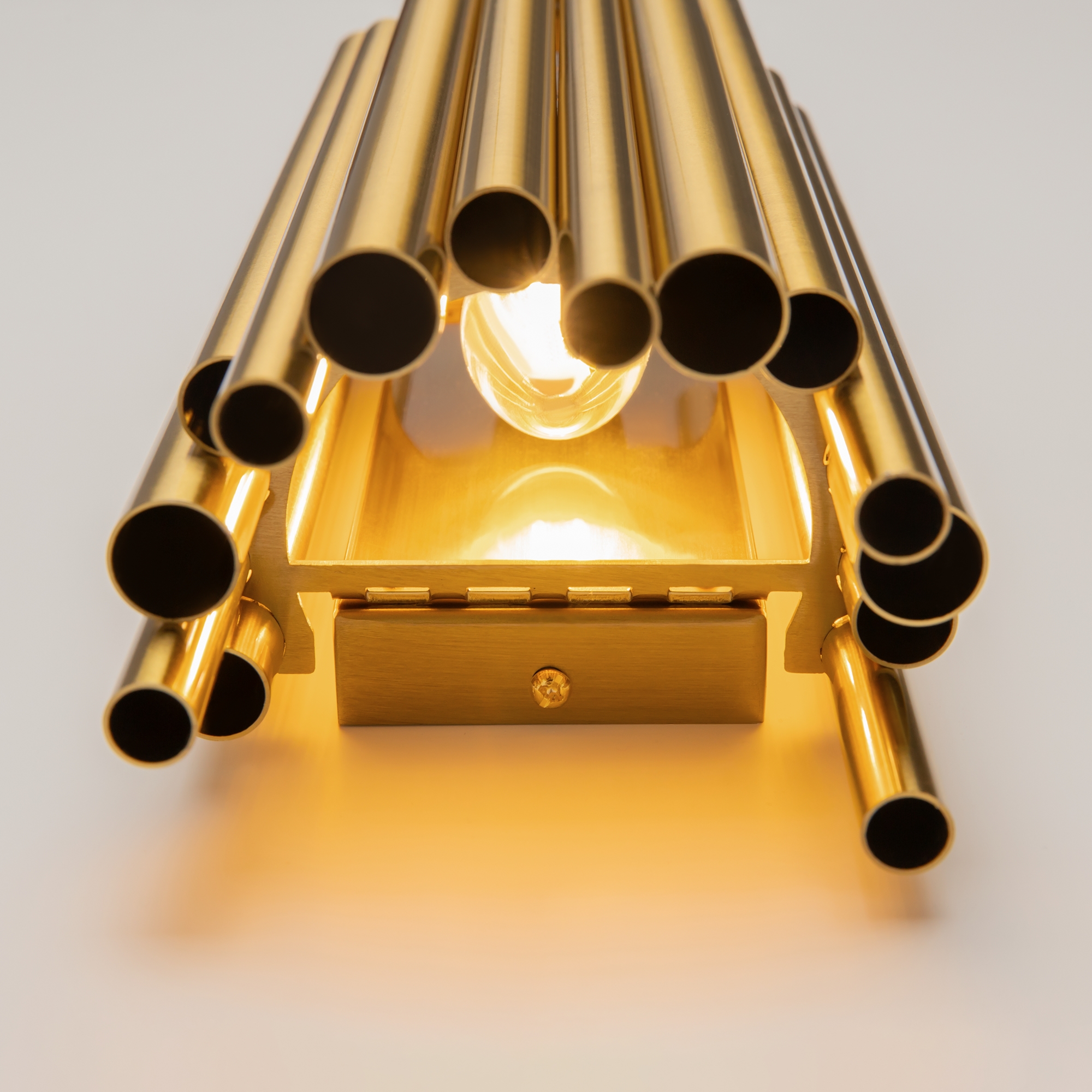 Особого внимания заслуживает оригинальный декор в виде трубок из нержавеющей стали в бронзовом цвете. Последний ряд декоративных элементов представлен стеклянными трубками, которые придают изделию легкость и создают впечатление невесомого силуэта. Такое решение делает светильник не только источником света, но и настоящим арт-объектом.