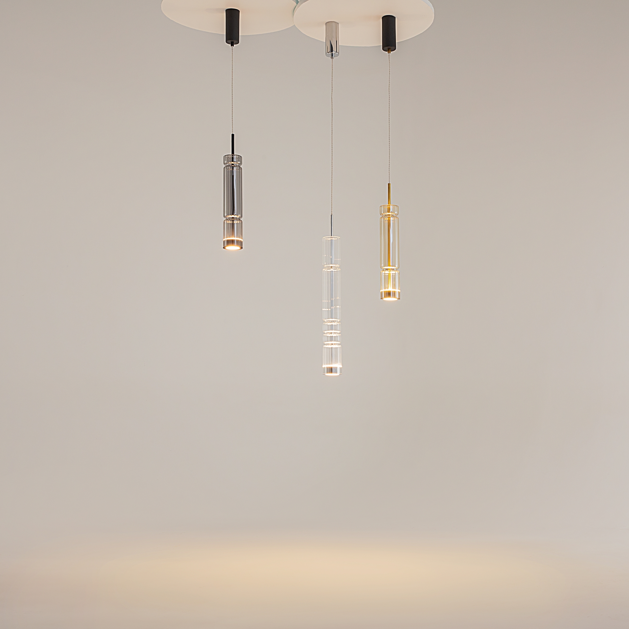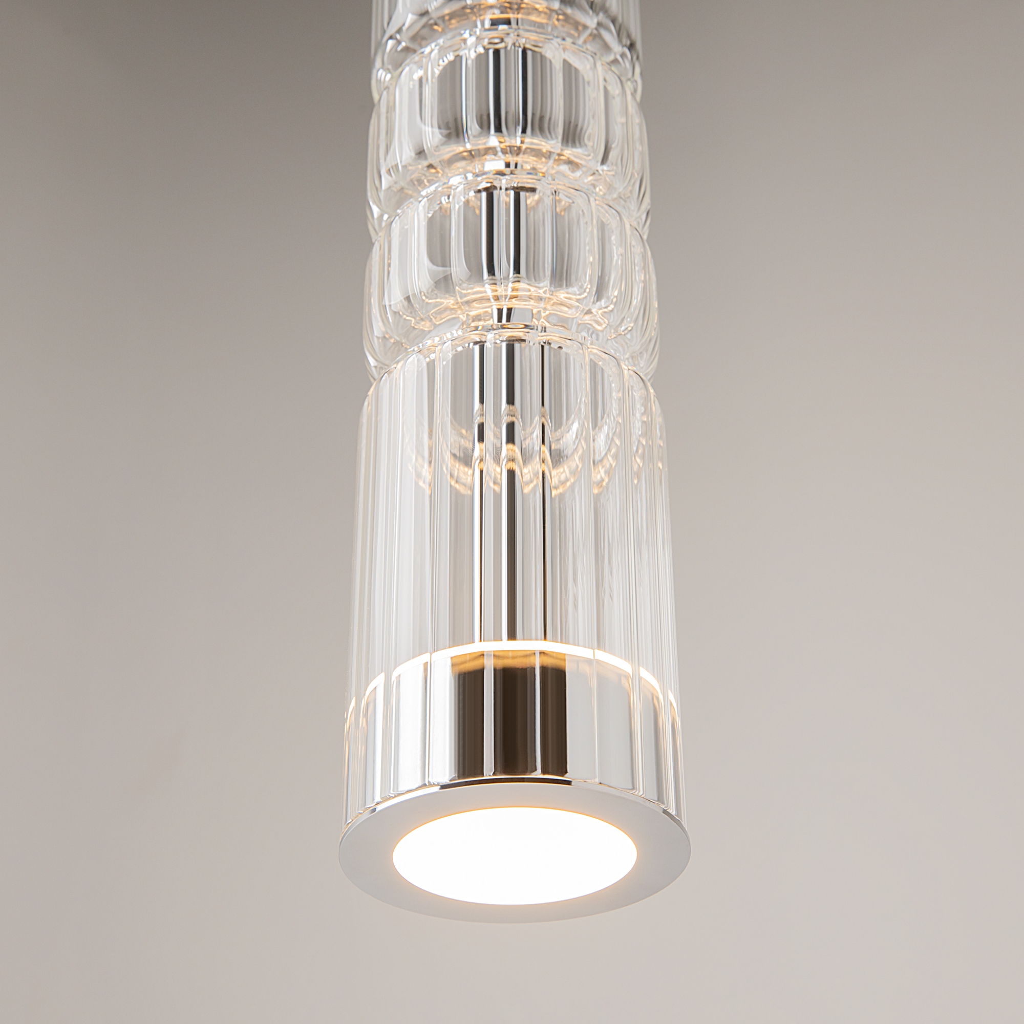 Светильник имеет хромированную металлическую арматуру, которая эффектно контрастирует с прозрачными стеклянными плафонами, украшенными вертикальным рельефным рисунком. Особенностью модели является использование стеклянных плафонов в трех оттенках: прозрачный, коньячный и дымчатый, что создает интересную игру света и теней при включении.