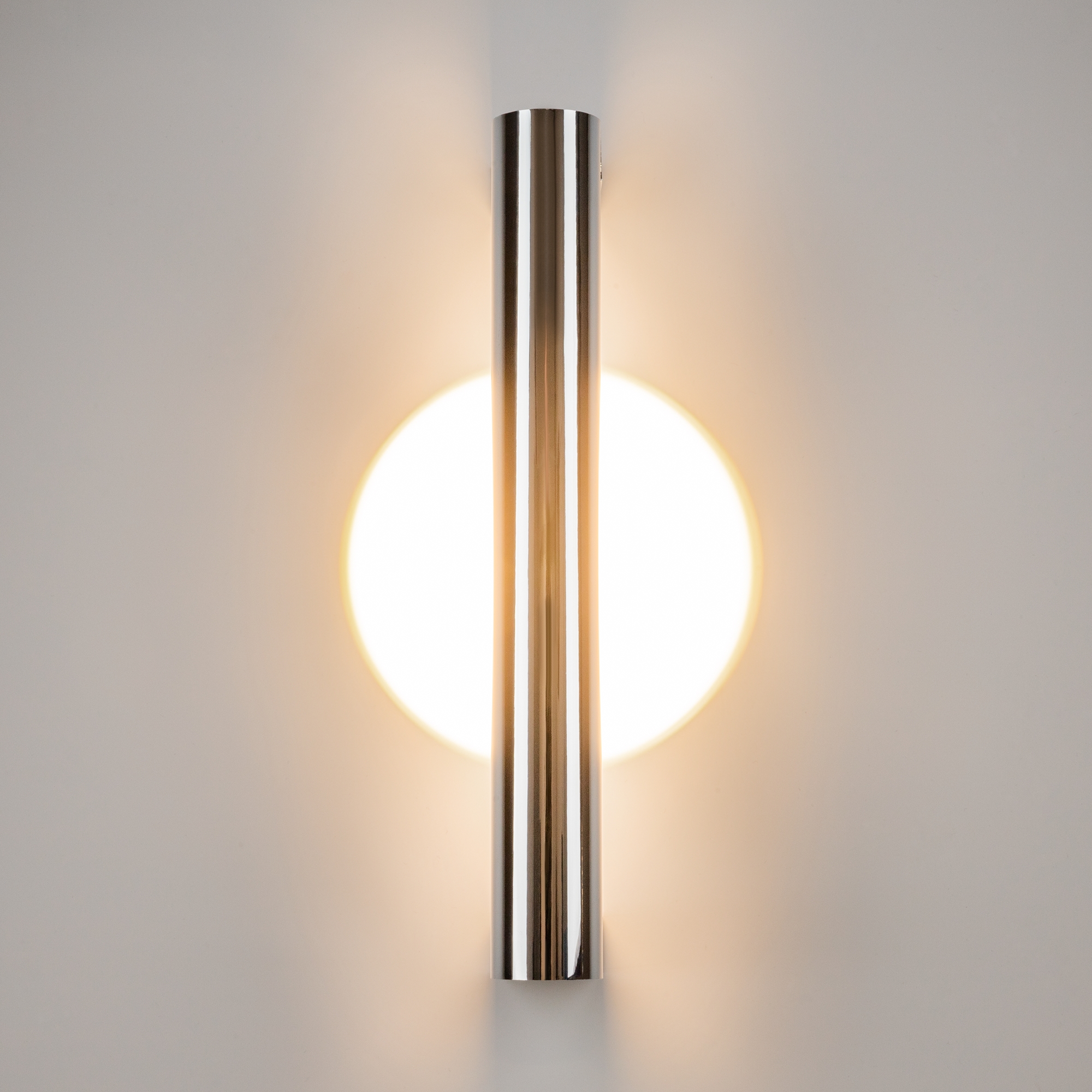 Белый акриловый абажур деликатно рассеивает свет, создавая мягкое, неагрессивное освещение. Уникальное дизайнерское решение с использованием специальной линзы создает эффектный акцентный круг света на стене и обеспечивает красивый эффект переотражения, что делает светильник не просто источником света, а настоящим элементом декора.
