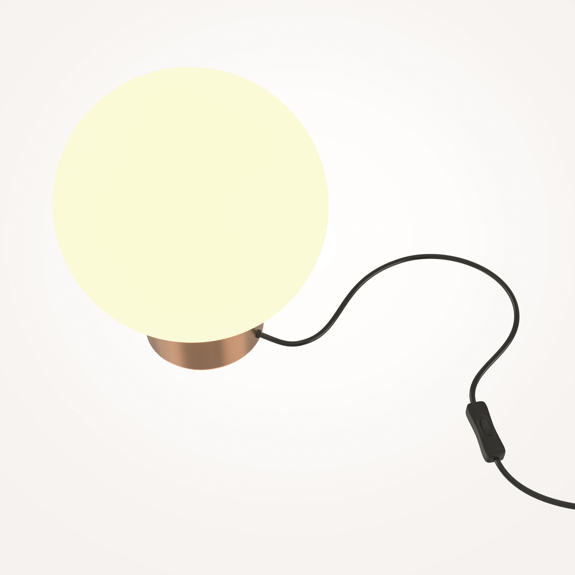 Округлый плафон диаметром 200 мм изготовлен из матового белого стекла, которое мягко рассеивает свет и создает уютную атмосферу. Общая высота светильника составляет 237 мм, что делает его идеальным для установки на рабочем столе, прикроватной тумбочке или журнальном столике.