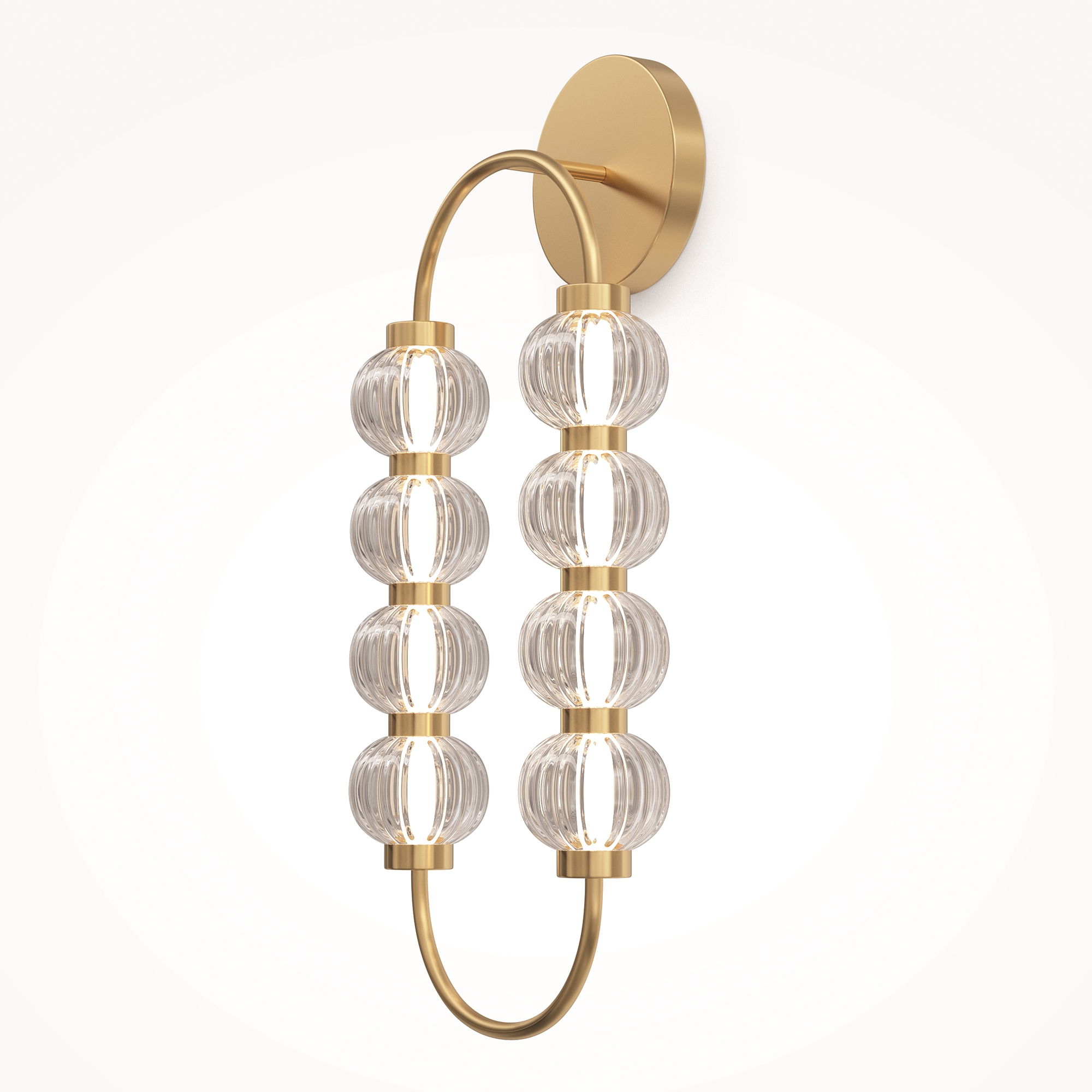 Бра MOD555WL-L11G3K выполнено в элегантном современном стиле. Металлическая арматура благородного золотого цвета гармонично сочетается с прозрачным стеклянным абажуром. Особую выразительность светильнику придает акцентный декор в виде рельефных сфер из литого стекла, который создает эффектную игру света и тени.