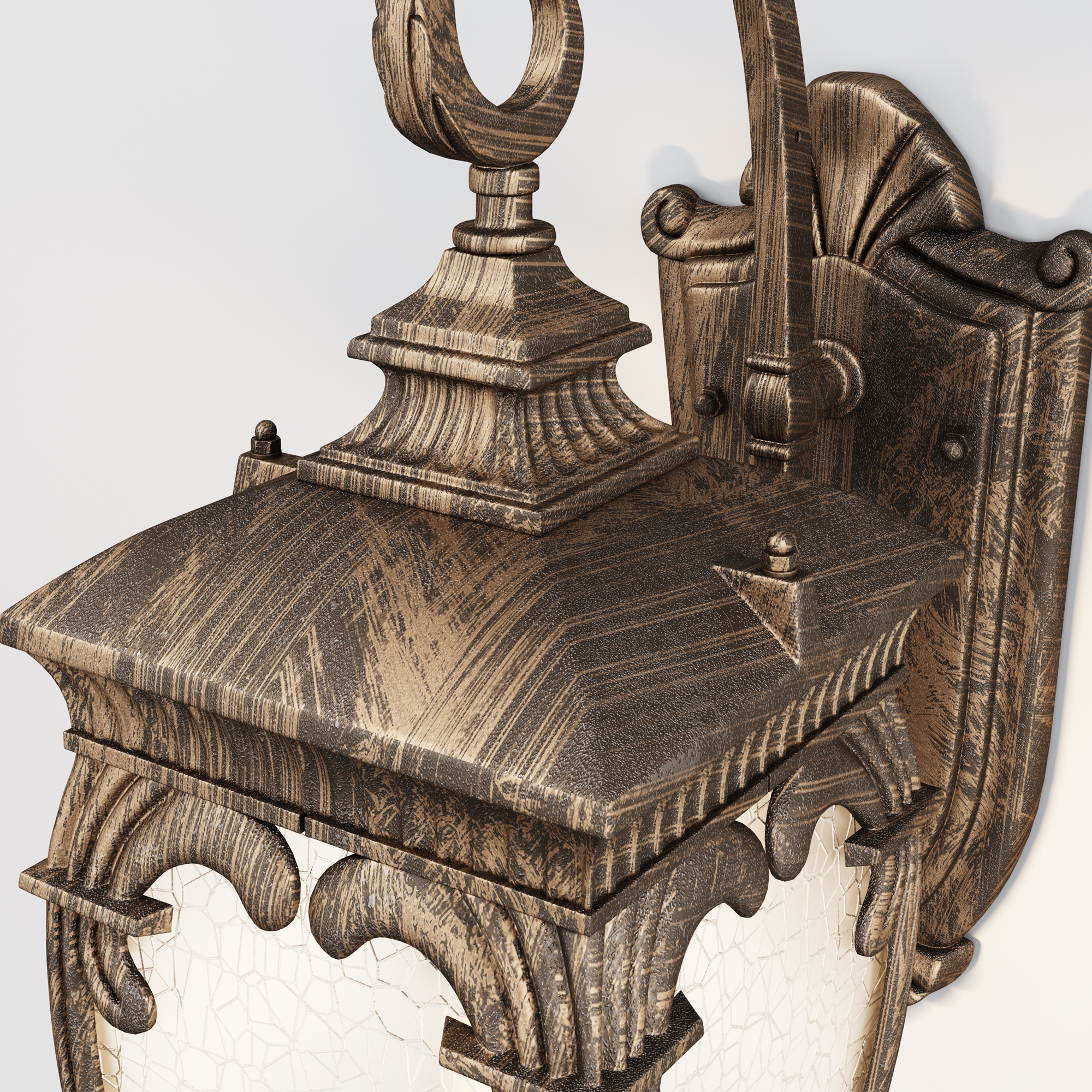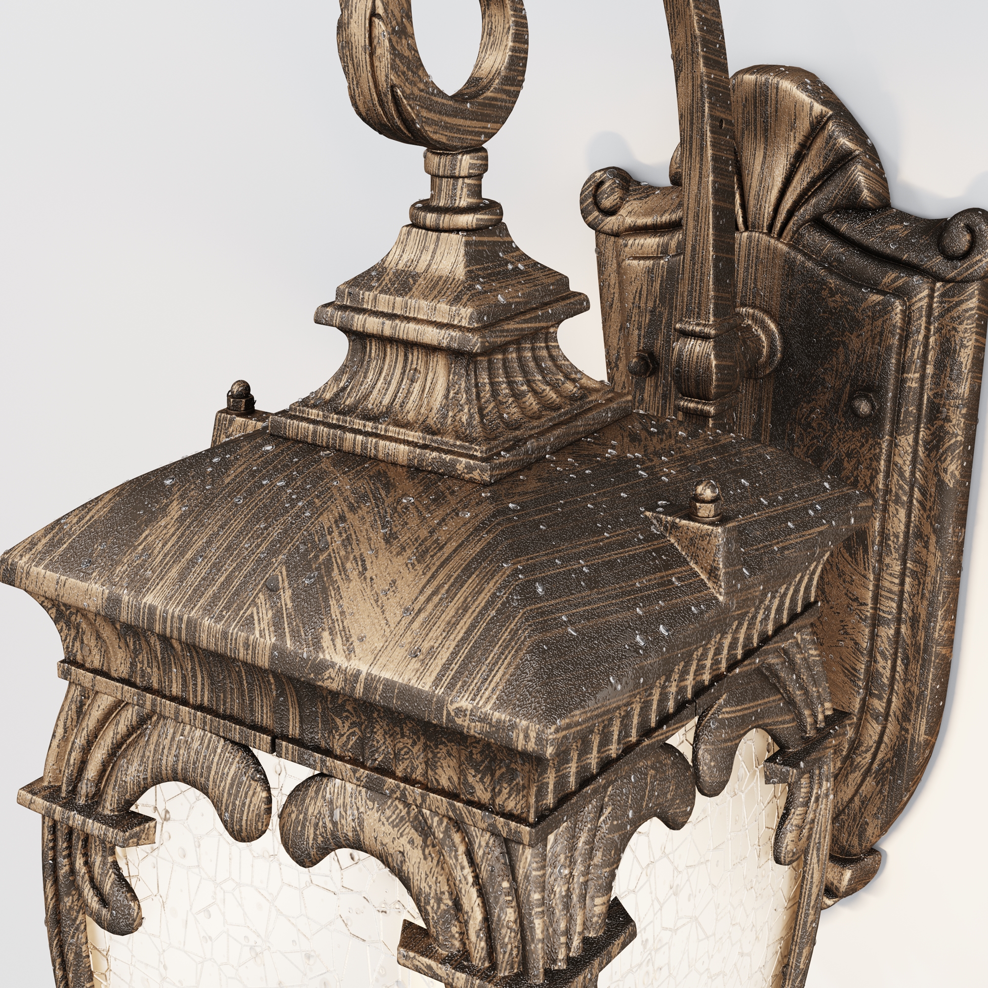 Светильник выполнен в классическом стиле с элегантным сочетанием черного и золотого цветов. Корпус изготовлен из прочного алюминия, обеспечивающего долговечность и высокую устойчивость к атмосферным воздействиям. Особую привлекательность модели придает стеклянный плафон, обработанный с использованием декоративной технологии PULEGOSO, которая создает эффект пузырьков воздуха внутри стекла. Этот уникальный визуальный элемент придает светильнику особый шарм и оригинальность.
