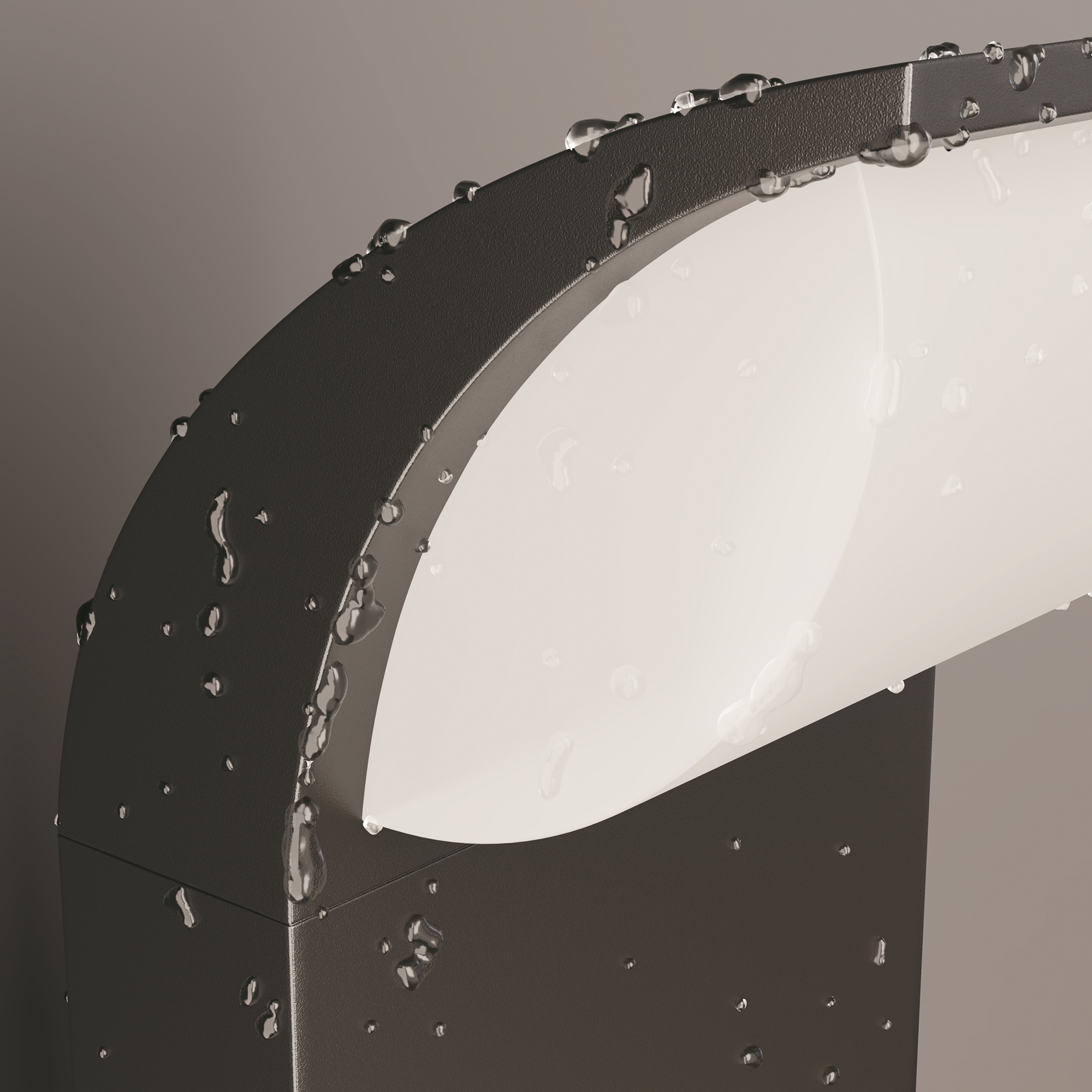 Корпус светильника выполнен из комбинации алюминия и пластика, окрашен в элегантный графитовый цвет, что делает его органичным дополнением любого ландшафтного дизайна. Светильник оснащен белым матовым рассеивателем, который обеспечивает мягкое, равномерное распределение света без ослепляющего эффекта.