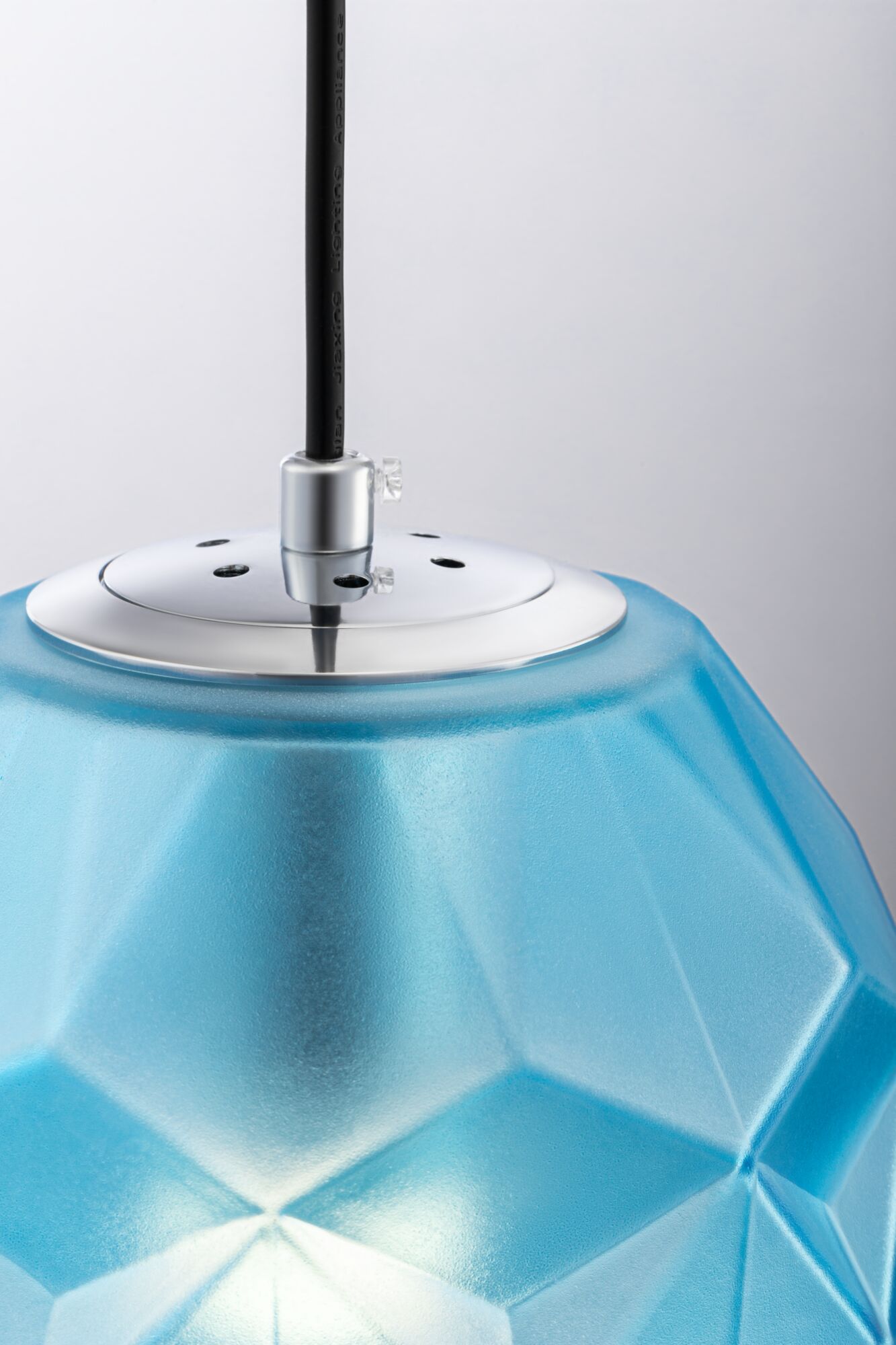 Арматура светильника выполнена из прочного металла с хромированным покрытием, которое отлично гармонирует с голубым цветом плафона и добавляет изделию изысканности. Крепление осуществляется с помощью круглой монтажной планки (чаши) диаметром 100 мм и высотой 25 мм.