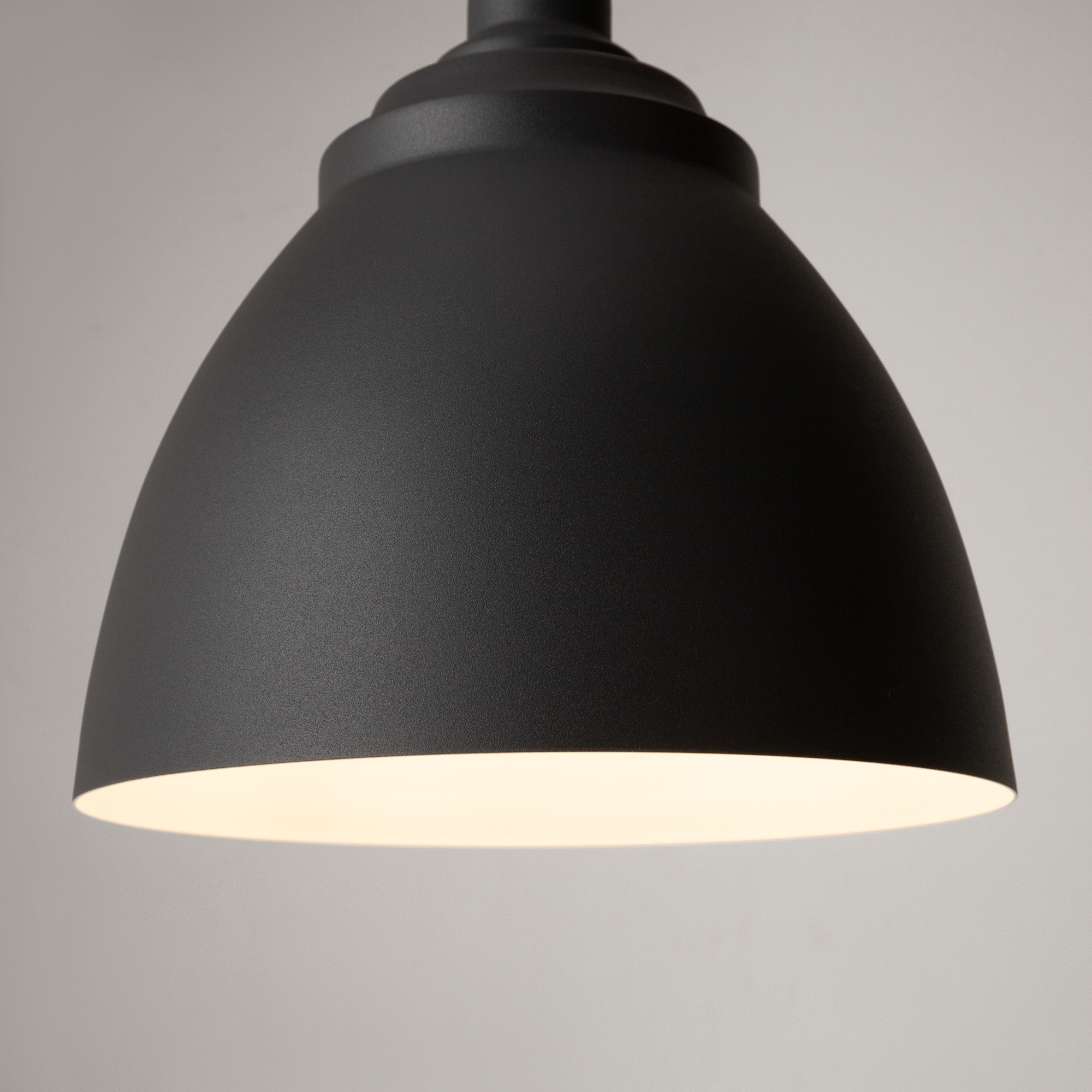 Светильник выполнен в лаконичной геометрической форме. Абажур имеет форму конуса с нижним диаметром 250 мм и высотой 205 мм. Арматура и абажур изготовлены из высококачественного металла с порошковым окрашиванием в черный цвет с эффектом муара, что придает поверхности особую визуальную глубину и текстуру. Этот эффект создает неповторимую игру света и тени при включенном светильнике.
