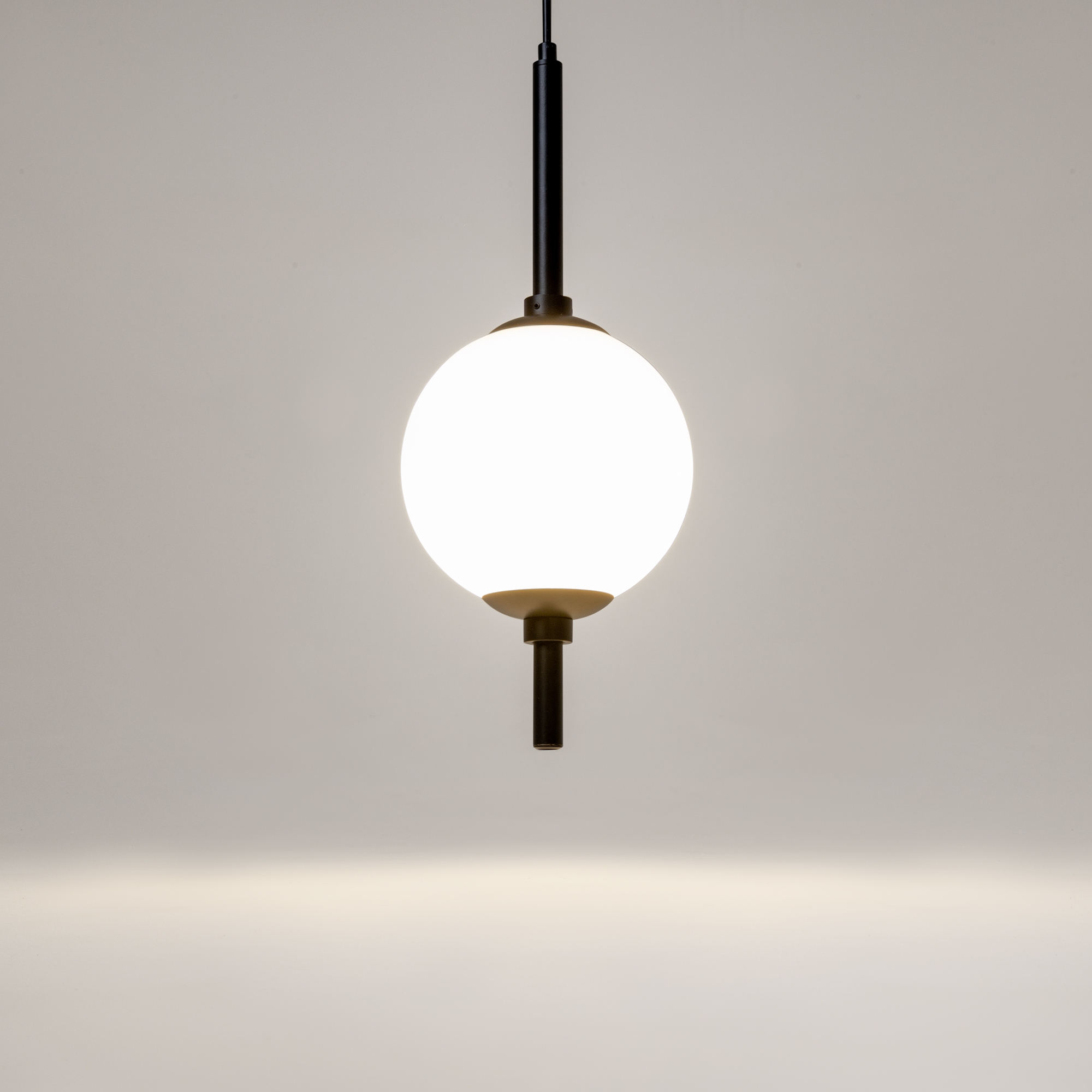 Общая высота светильника составляет 3510 мм, при этом минимальная высота регулируется до 630 мм, что позволяет адаптировать светильник под различные помещения. Диаметр плафона-сферы – 180 мм, что делает его заметным, но не громоздким элементом интерьера.