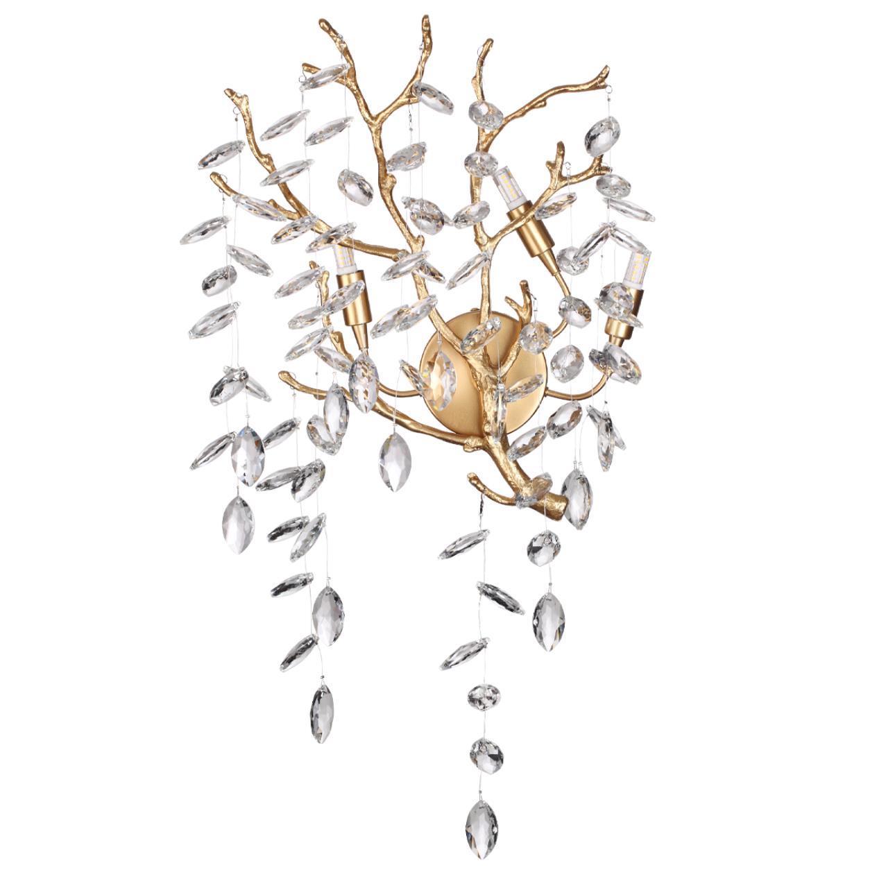Бра выполнено в цвете античная бронза с использованием высококачественного алюминия для арматуры и настоящего хрусталя для декоративных элементов. Хрустальные подвески, напоминающие лепестки или листья, создают потрясающую игру света и тени, переливаясь словно капельки росы в лучах утреннего солнца.