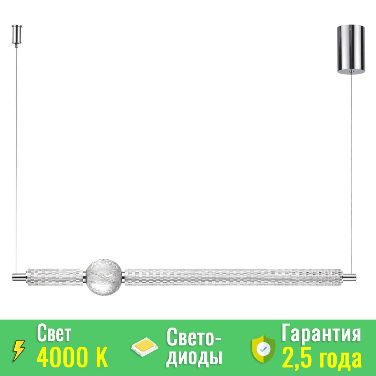 Подвес выполнен в элегантном хромированном корпусе с глянцевой поверхностью. Главной особенностью модели является горизонтальная линейная конструкция длиной 998 мм, украшенная акриловыми элементами с кристаллоподобной фактурой. Основа светильника — акриловый шар и множество декоративных колец, имитирующих хрустальную резную фактуру, что создает удивительную игру света и завораживающие переливы.