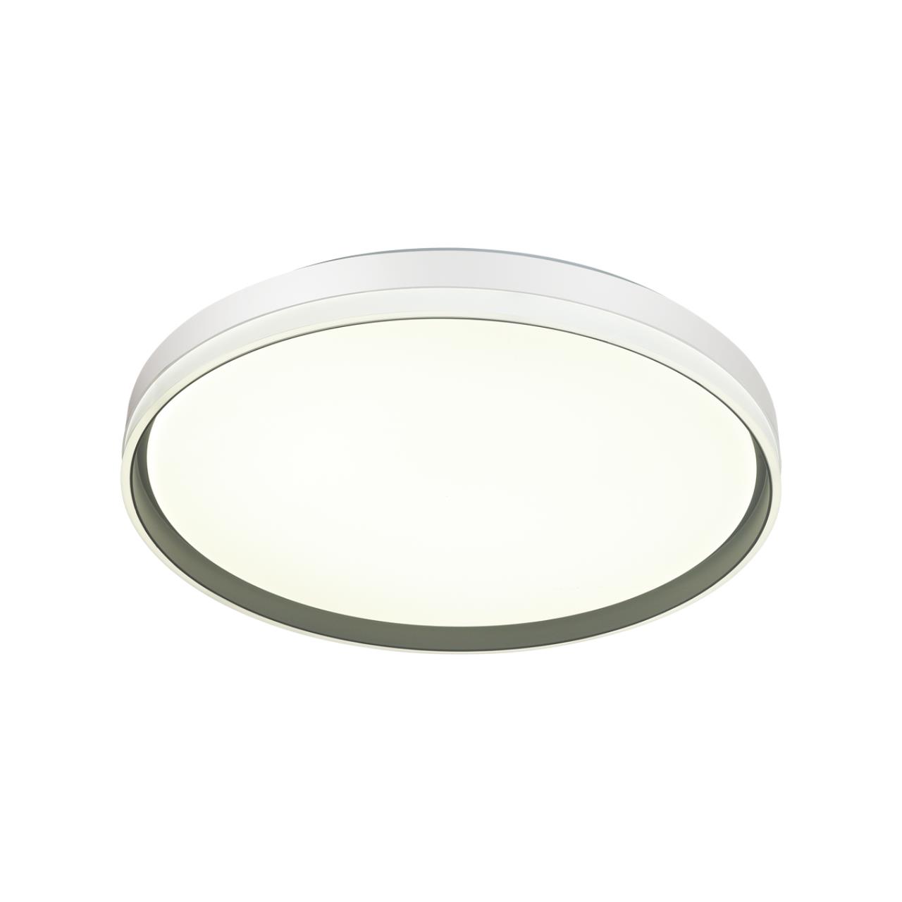 Светильник имеет круглую форму с диаметром 490 мм и высотой всего 70 мм, что делает его идеальным для помещений с невысокими потолками. Конструкция состоит из металлического основания (базы) белого цвета с глянцевой поверхностью и матового акрилового рассеивателя, который обеспечивает равномерное распределение света без бликов и теней.
