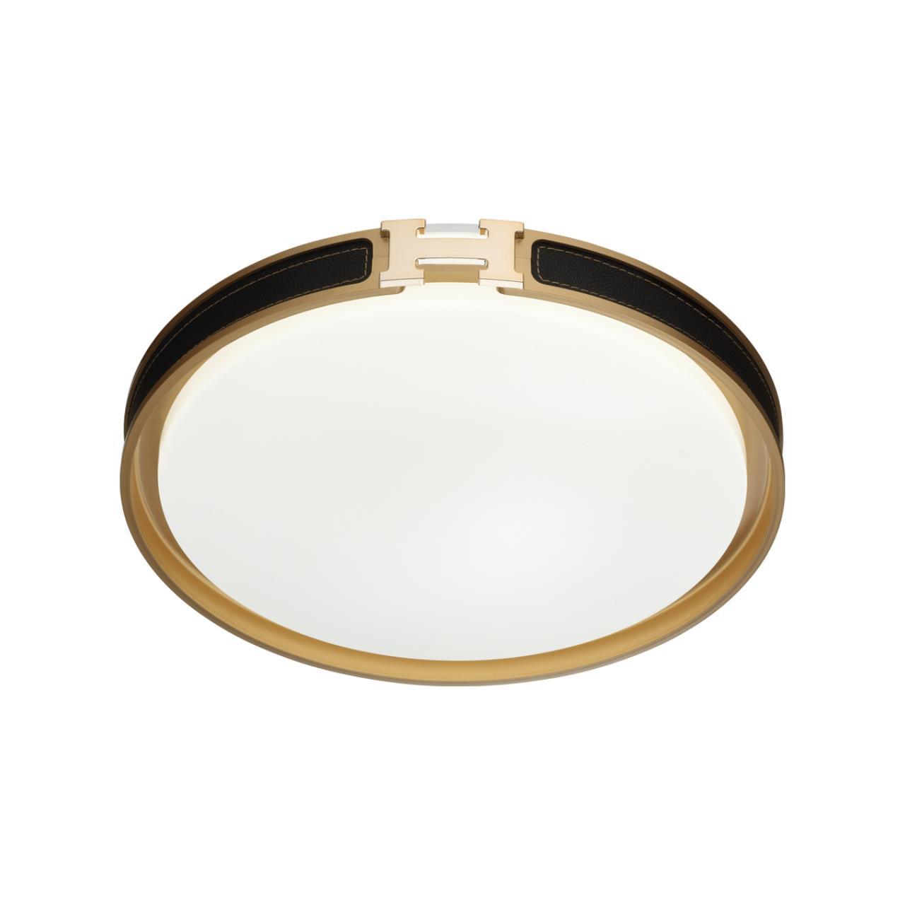 Особую элегантность светильнику придает декоративный обод из черной искусственной кожи, украшенный золотистой вставкой в виде пряжки ремня. Это сочетание белого, черного и золотого цветов делает модель универсальной и подходящей для различных интерьерных решений.