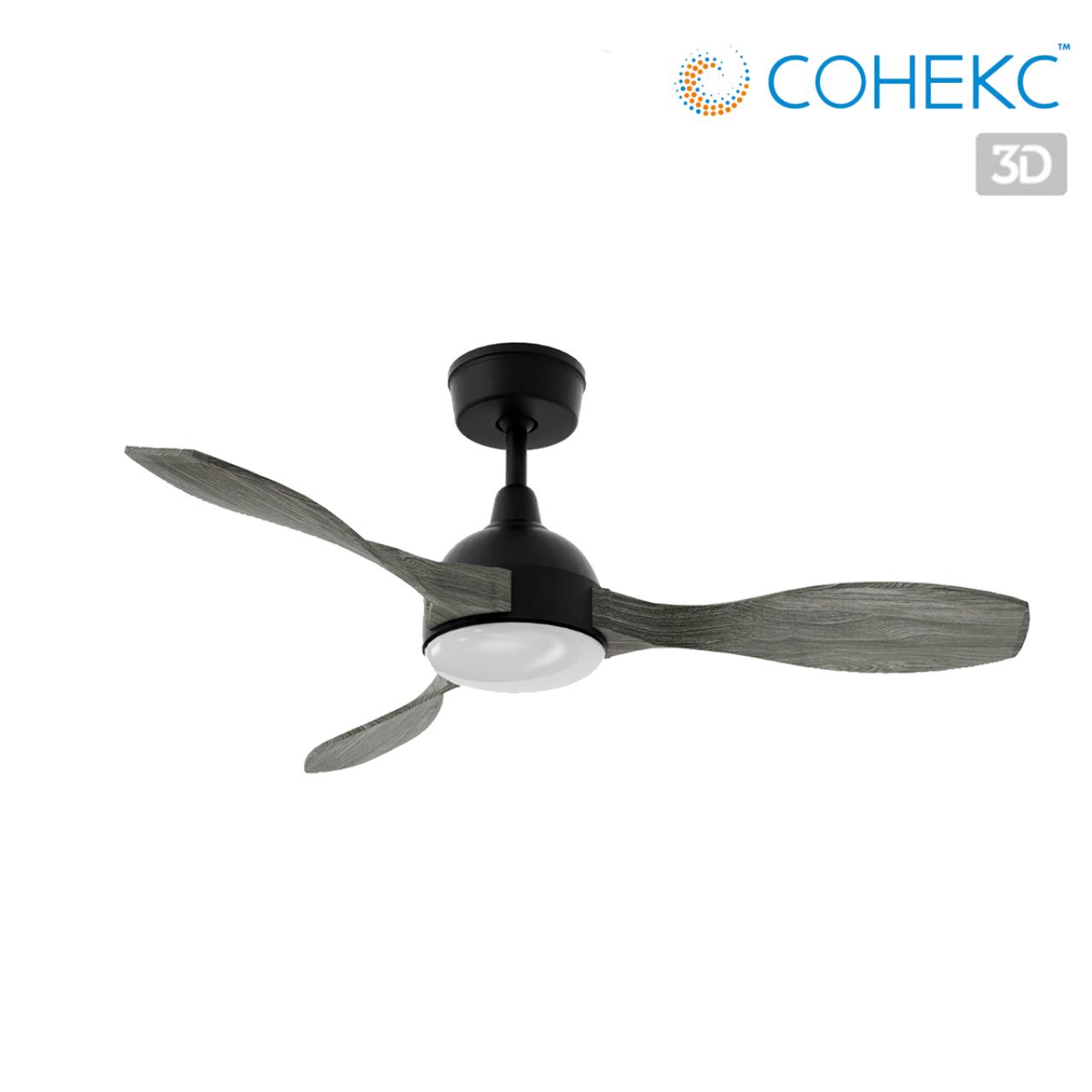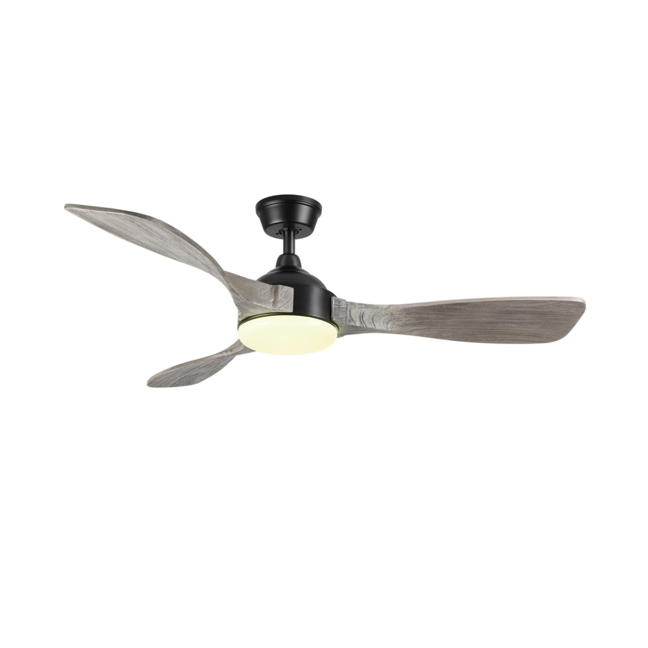 Светильник-вентилятор выполнен в стиле модерн, что делает его универсальным решением для современных интерьеров. Цветовое решение представлено комбинацией черной матовой арматуры и трех лопастей из массива дерева серого цвета. Центральную часть украшает круглый матовый плафон из акрила белого цвета, создающий мягкое и приятное освещение.